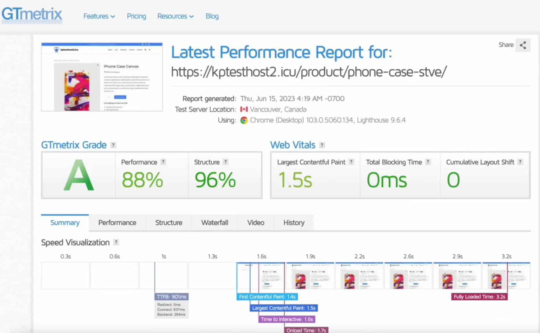 Now, when I checked the speed of my product page with GTmetrix, it loaded in 3.2 sec (in Canada) with an A grade and 88% performance score. Thus, the installation of NitroPack significantly improved website speeds.