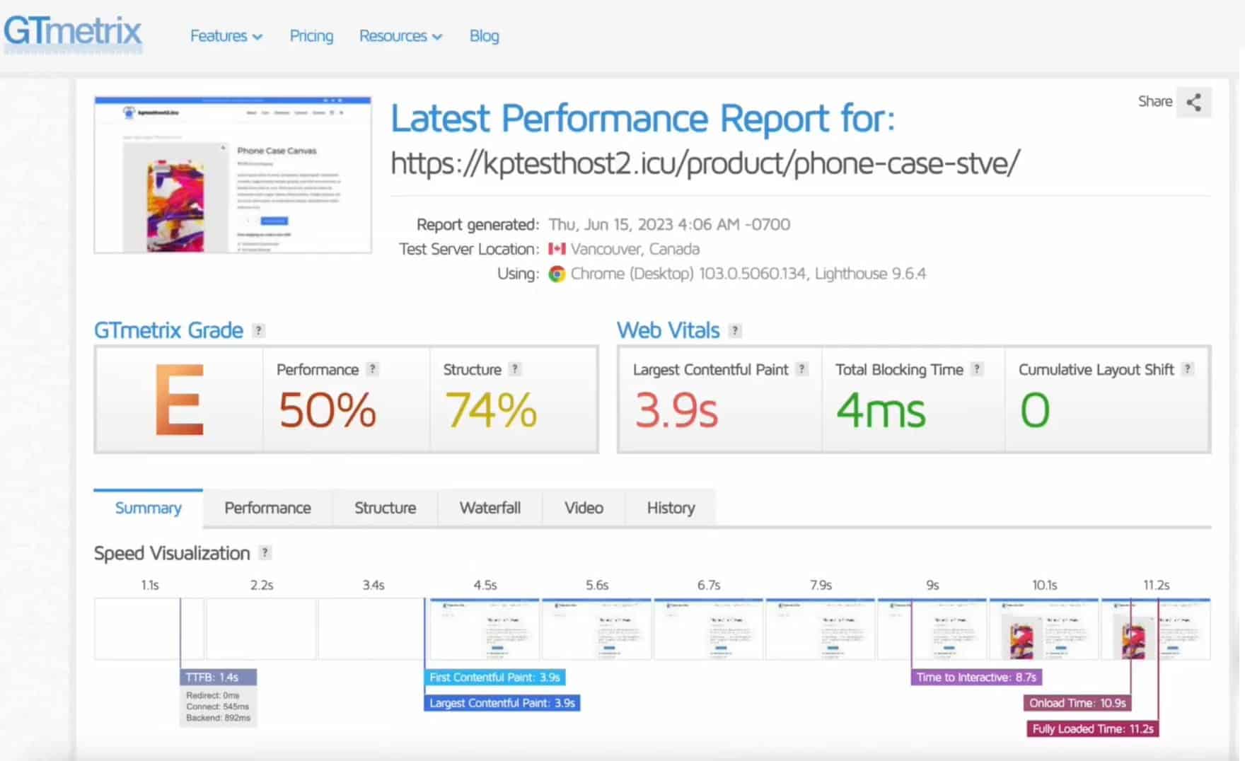 When I tested my website’s product page with GTmetrix, the fully loaded time was a massive 11.2 sec! Along with it, it displayed a 50% performance score with an overall E grade by GTmetrix.