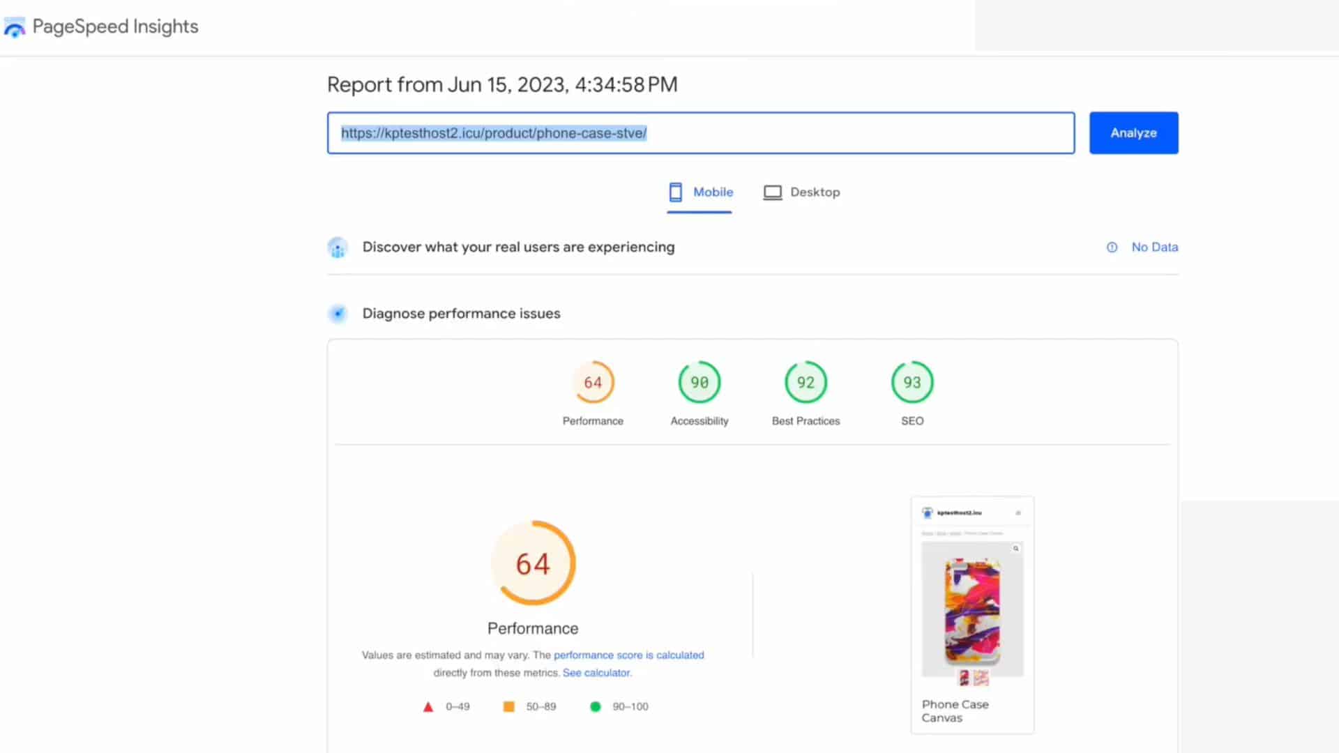 Then, I also used Google PageSpeed Insights to check the speeds. This time, my product page exhibited exceptional performance. The mobile performance score was 91! This is unbelievably fast!