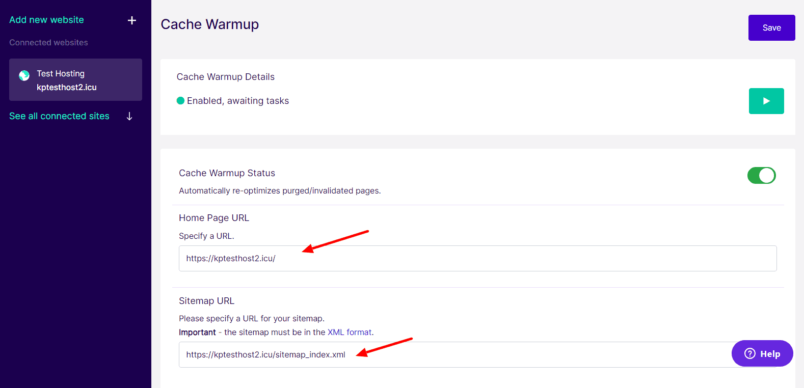 In order to enable this feature, you need to enter the URLs of your homepage and your Sitemap under the Cache Warmup Settings. This will ensure that the crawler visits all your web pages.