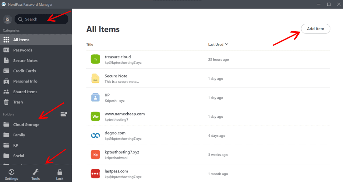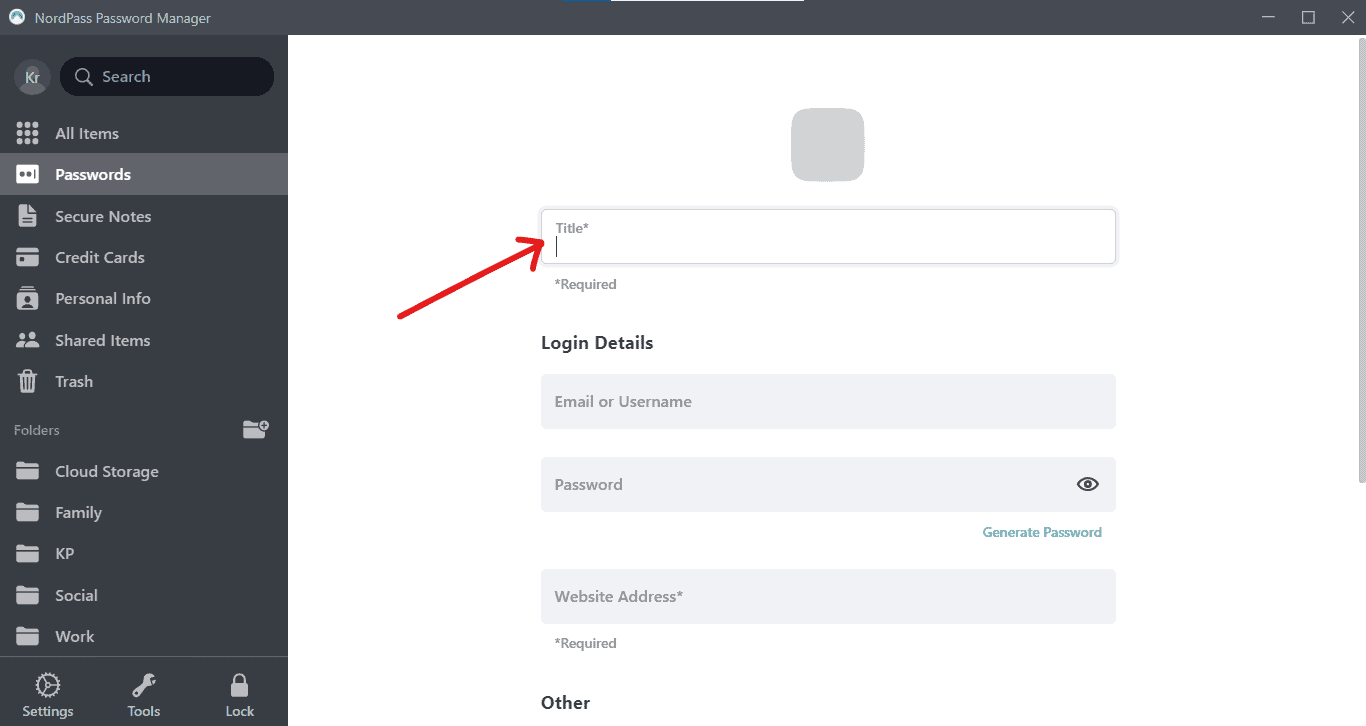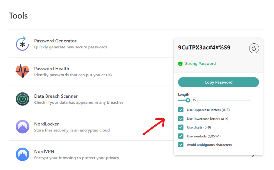 - Tools Button to access the password generator, check password health or breach reports, and even integrate with other Nord services like NordVPN and NordLocker.