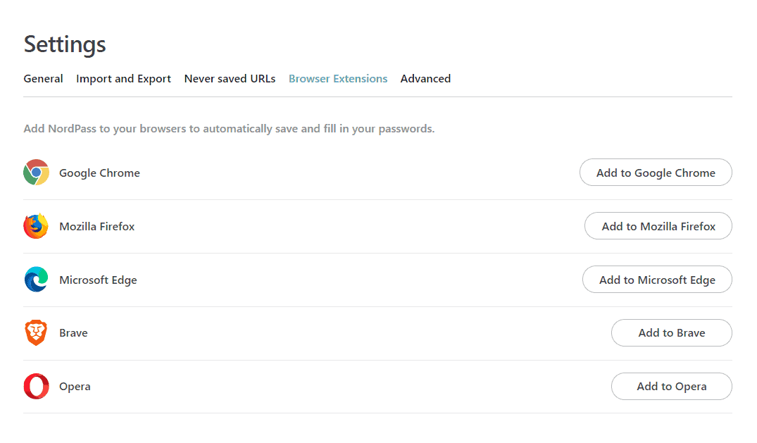 NordPass offers lightweight browser extensions for Chrome, Firefox, Brave, Edge, Opera, and Safari browsers.