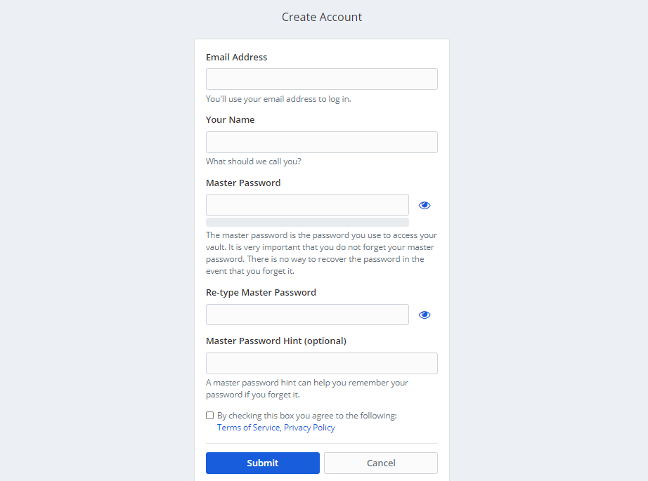 Step 1: First, let us start by creating an account on Bitwarden. You will need to enter your name, email, a strong master password you can memorize, and a master password hint in case you forget it!