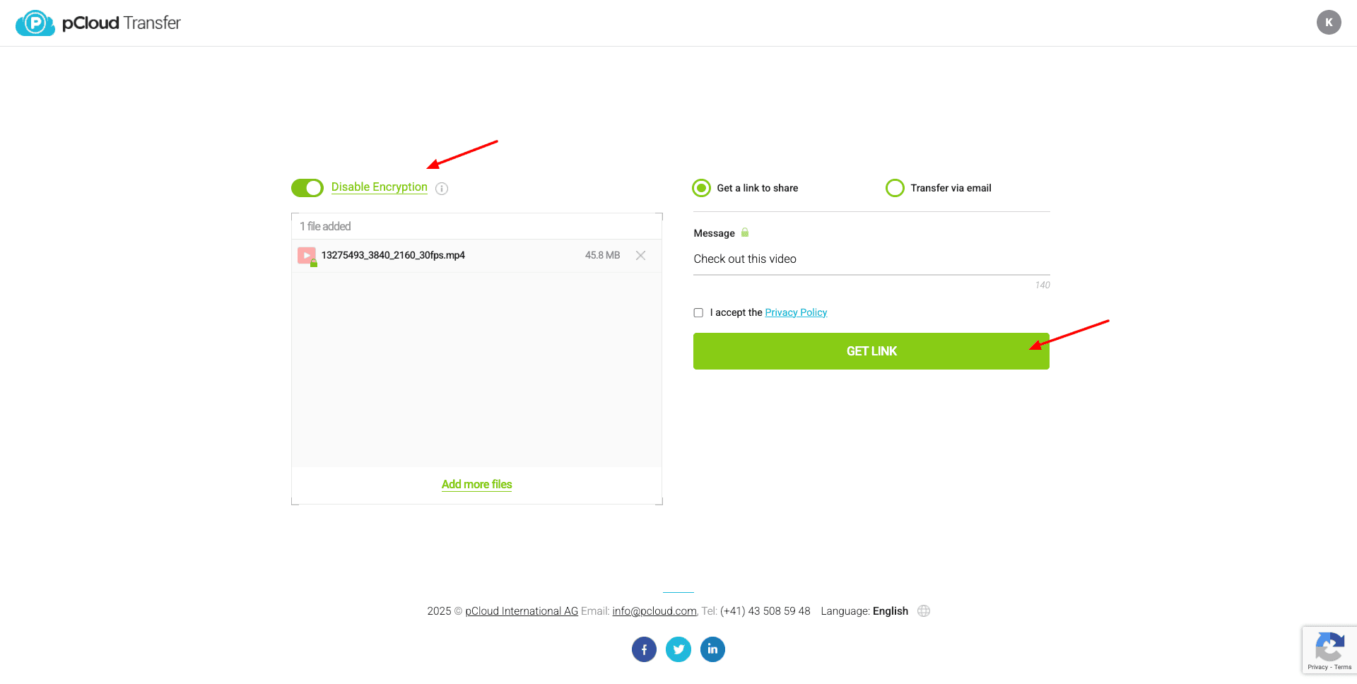 If you want to share sensitive files, you can enable encryption and set a secure password on your files. Check out this article to understand how to use pCloud Transfer.