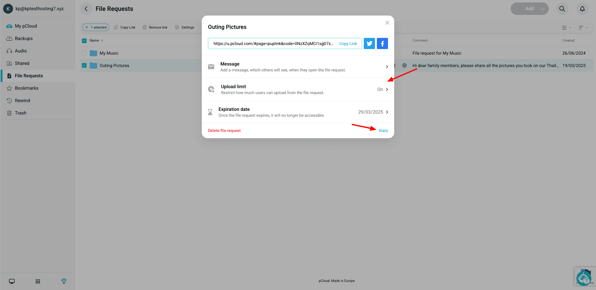 You can set a link expiry date, an upload limit for files, and also add a message for requesting files. Under file stats, you can also check the number of uploaded files and the space they consumed. This feature makes it easy to collect outings or event pictures, assignments, etc.