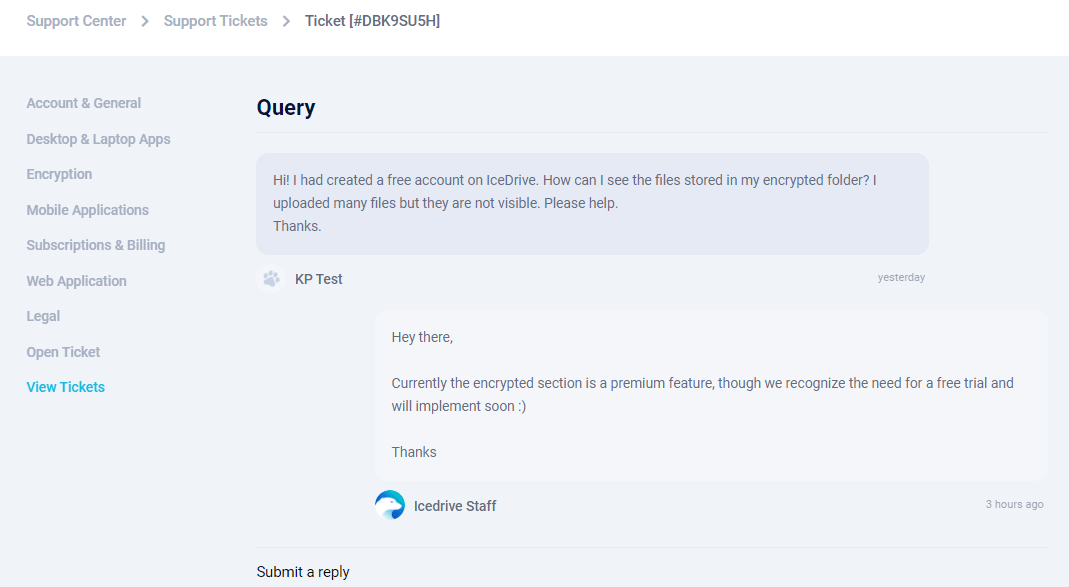 Similar to pCloud, Icedrive also offers email-based support with an average response time ranging from 1 to 2 days. It also offers a live chat support that offers quick and informative responses.