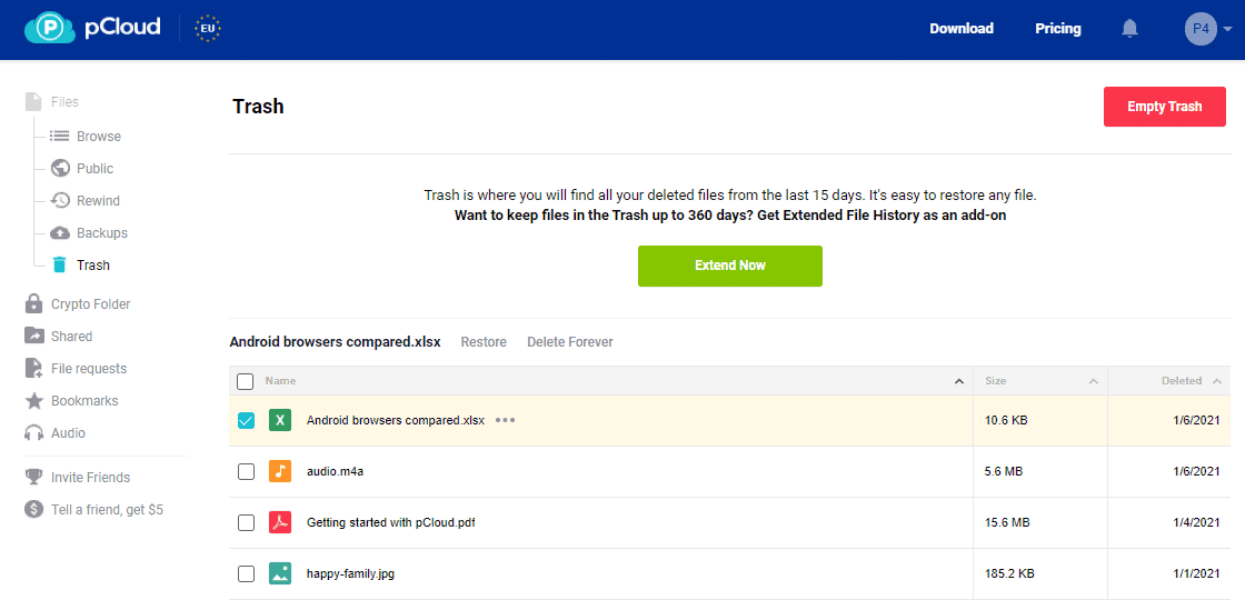 With pCloud, you get 30 days of trash support. This means that all your deleted files are stored in the Trash bin for 30 days.