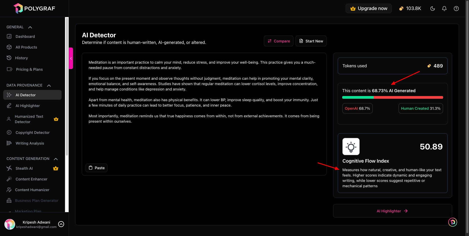 • Cognitive Flow Index: It evaluates how creative and natural your text feels.