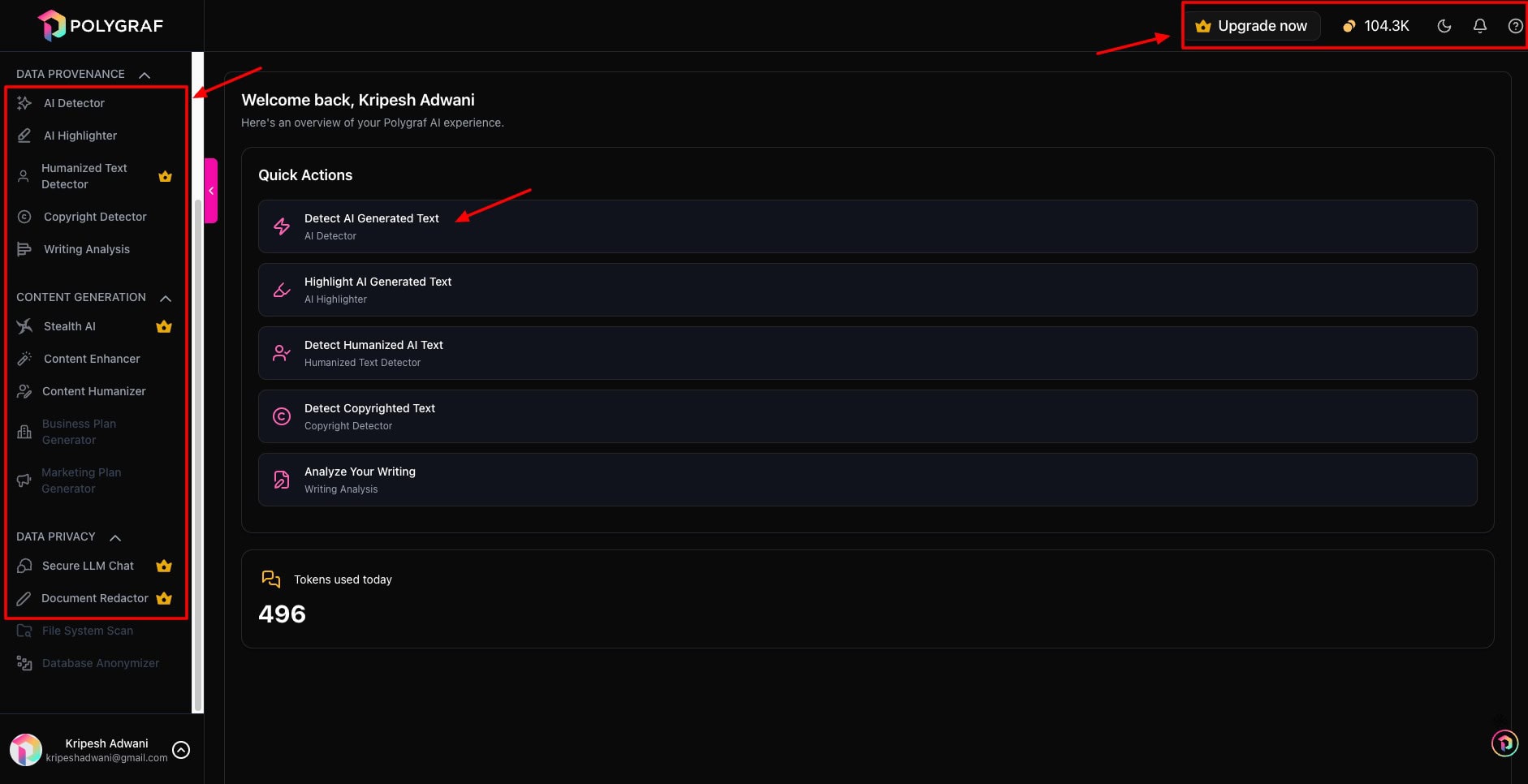 The user interface of Polygraf AI is pretty modern and pleasing. The main screen features a list of quick actions along with the number of tokens used. The left panel has a list of all the tools and features you could use, along with account settings.