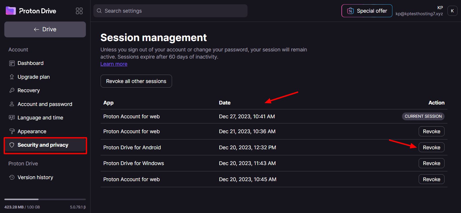 - Session Management: You can view which devices are logged in to your Proton Drive account along with the login date. It also allows you to revoke access to the devices you don’t use.