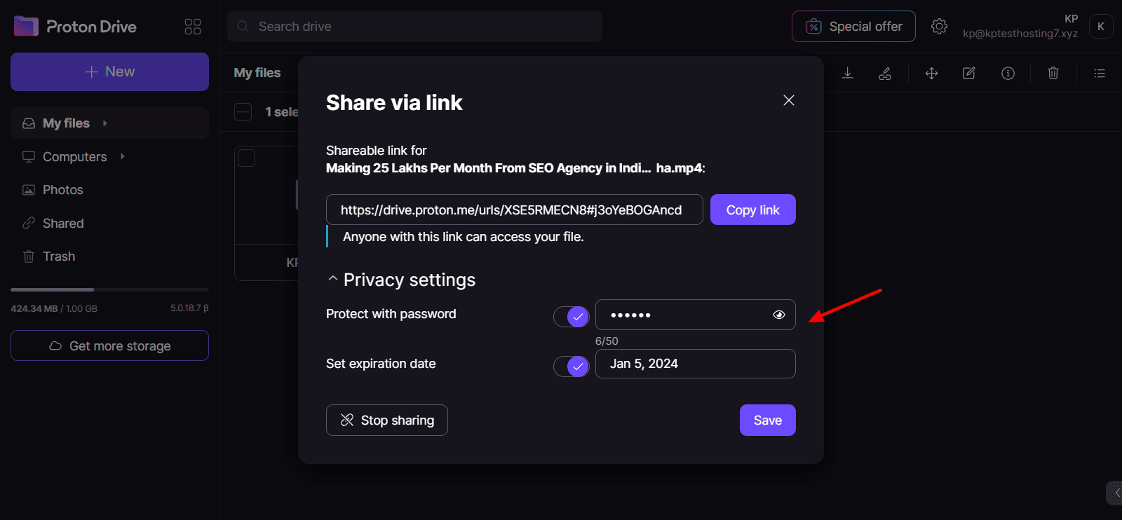While sharing a file or folder, you can get a public link. Proton Drive also allows you to set a password and link expiry date for it, even on the free versions. So, the receiver can only access the file upon entering the password. This adds another layer of security to your shared files.