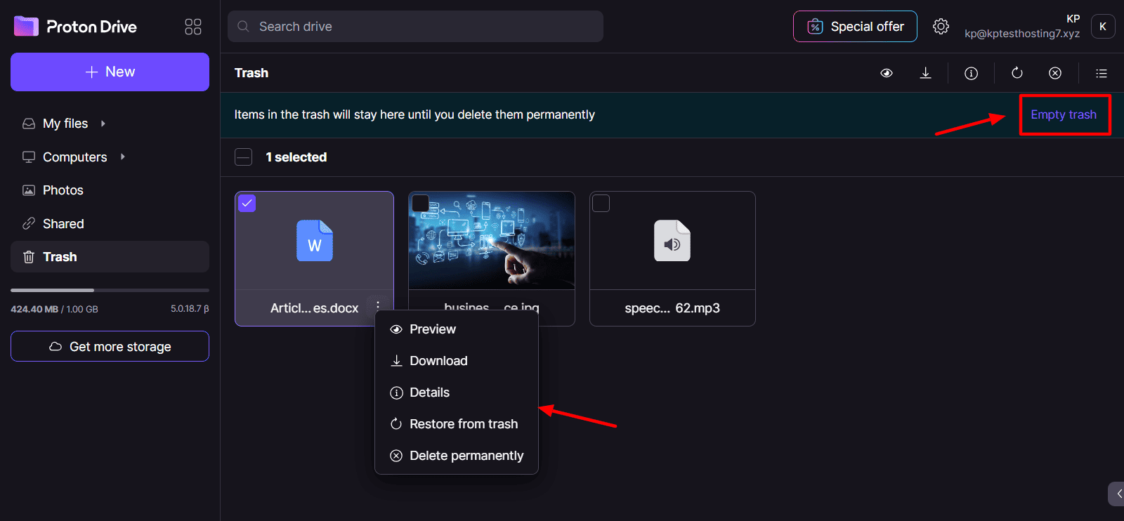 Your deleted files and folders stay in the Trash till you delete them manually. This is much better compared to other cloud storage that offers a 30-day trash limit. However, the Trash folder occupies space from the main storage itself.