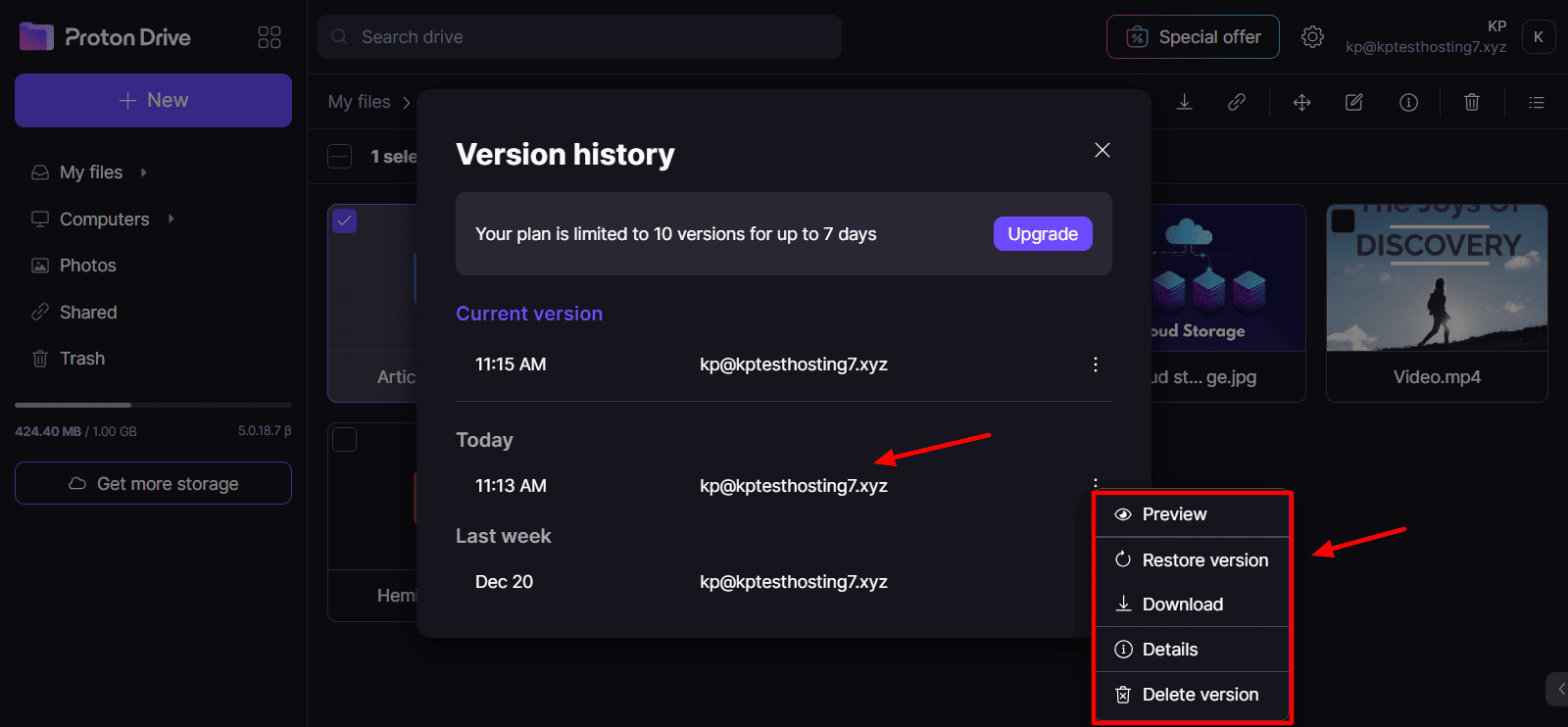 Interestingly, Proton Drive supports file version history even on its free plan. You can restore a maximum of 10 revisions up to 7 days on its free version. The revisions can be previewed, downloaded, and restored.