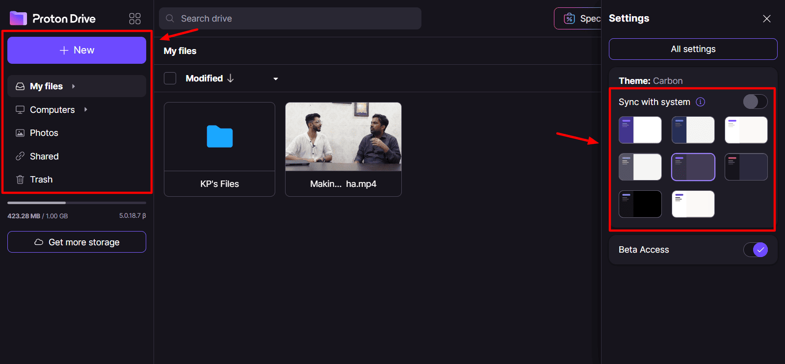 The user interface of Proton Drive looks modern and responsive. It features attractive and pleasing colors that appeal to the viewers. You can easily switch between the list or grid layout and choose from 8 elegant themes. I really liked the dark mode themes.