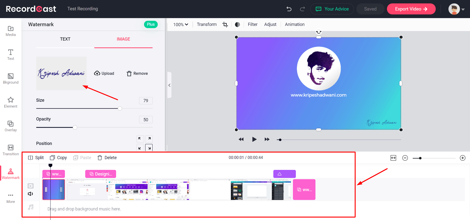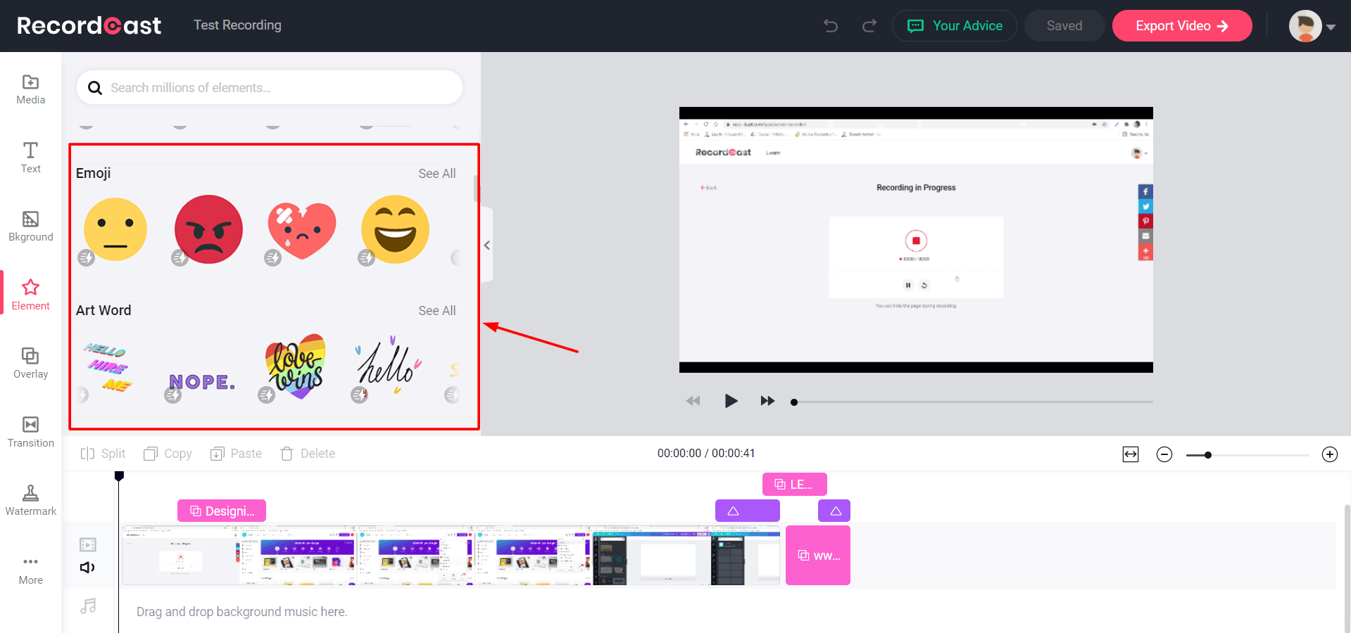 Once you are done recording your screen, RecordCast also lets you edit your video in the browser itself! You’ll find a lot of attractive elements and transitions to make your video more engaging, like: