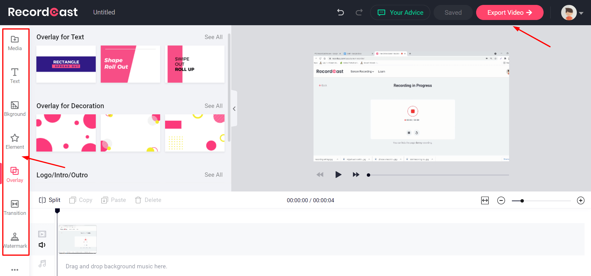 - Overlays for text, decoration, and video intros and outros can be selected.