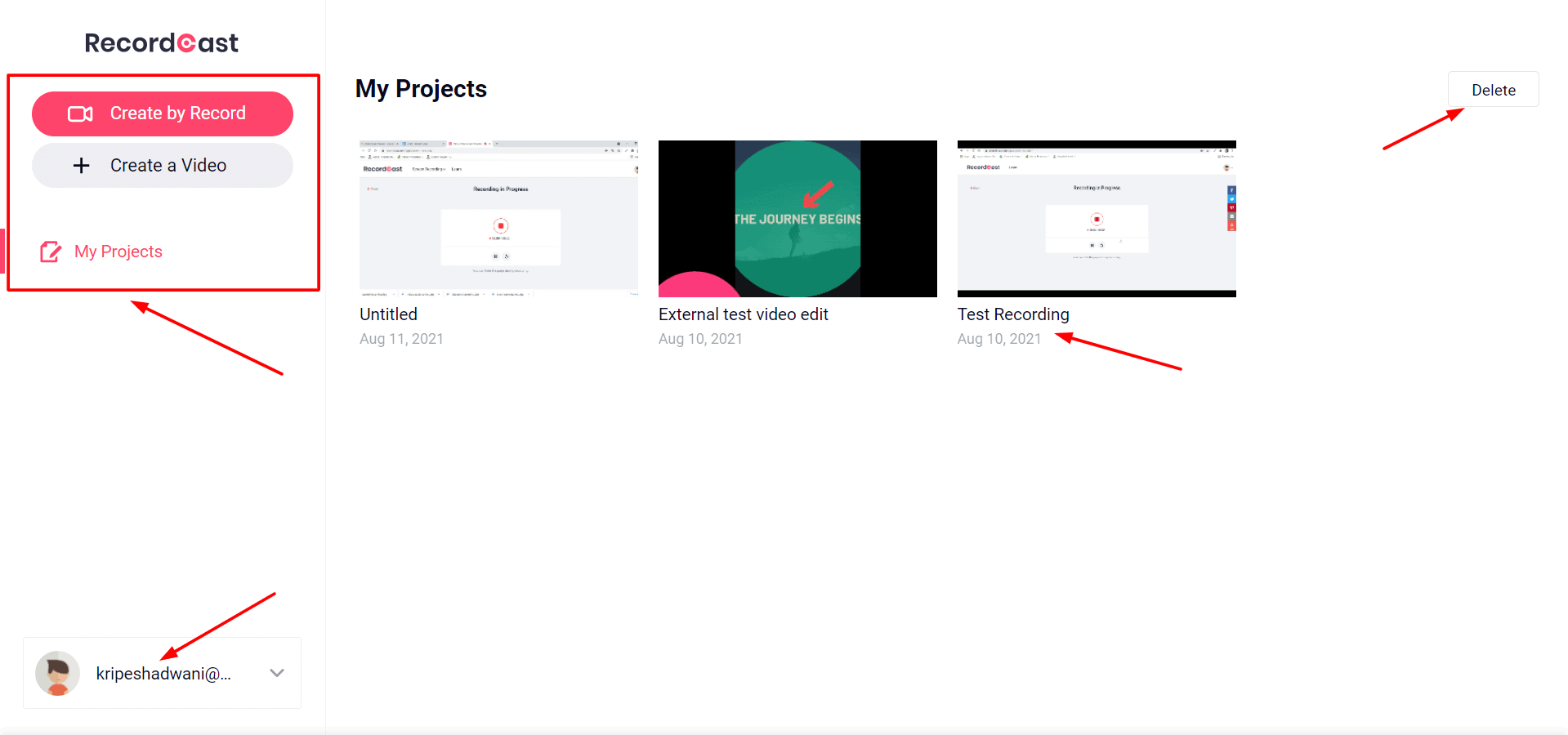 As you log in to your RecordCast account, you are greeted with a simplistic interface. The left panel displays the recording options and the ‘My Projects’ tab shows a list of your projects.