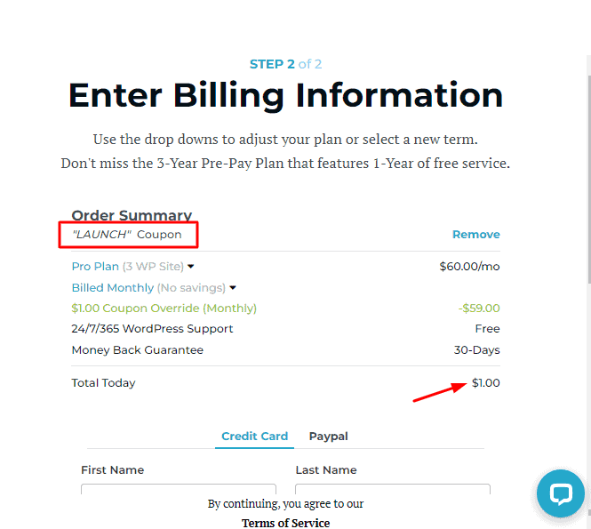 Now, under the Billing information, use the coupon code ‘LAUNCH’ to get your hosting for merely $1 for the first month
