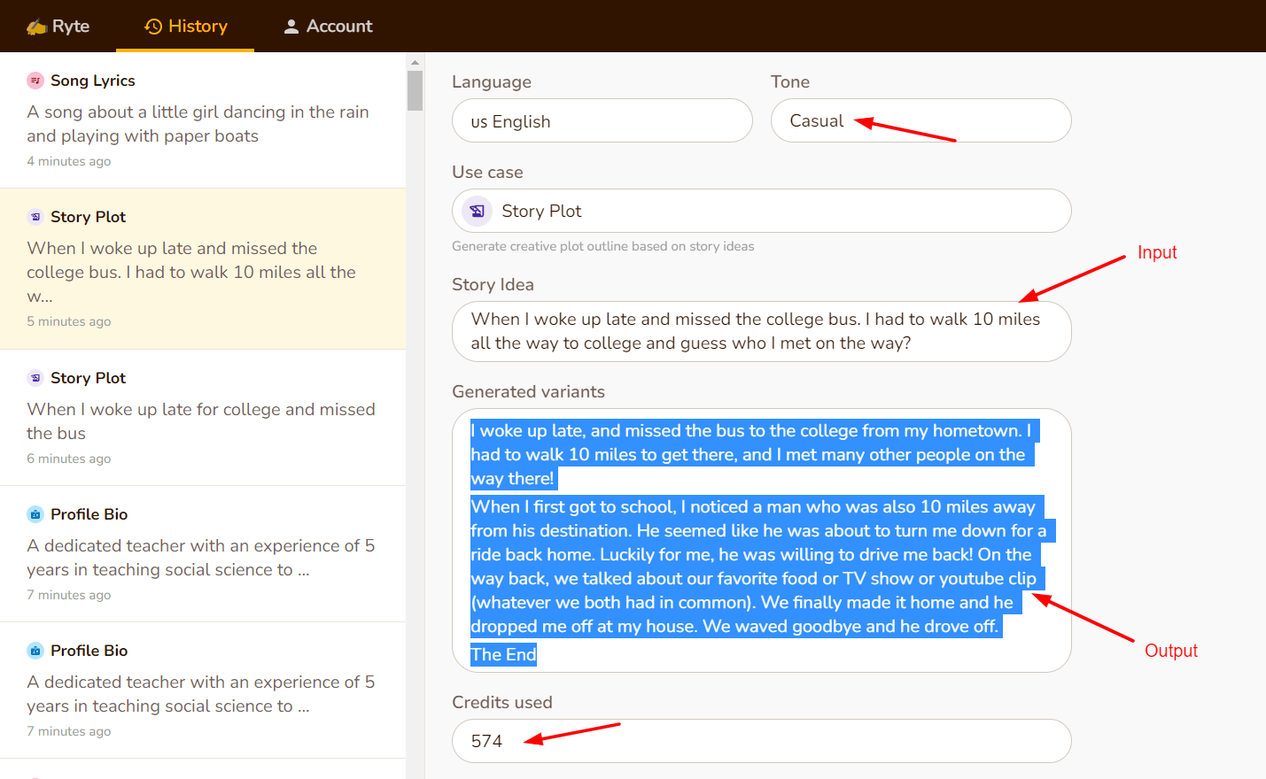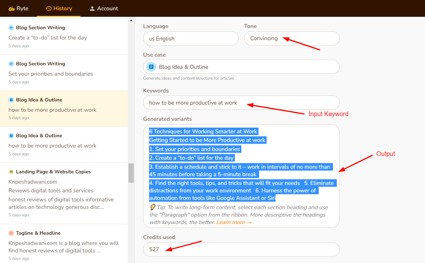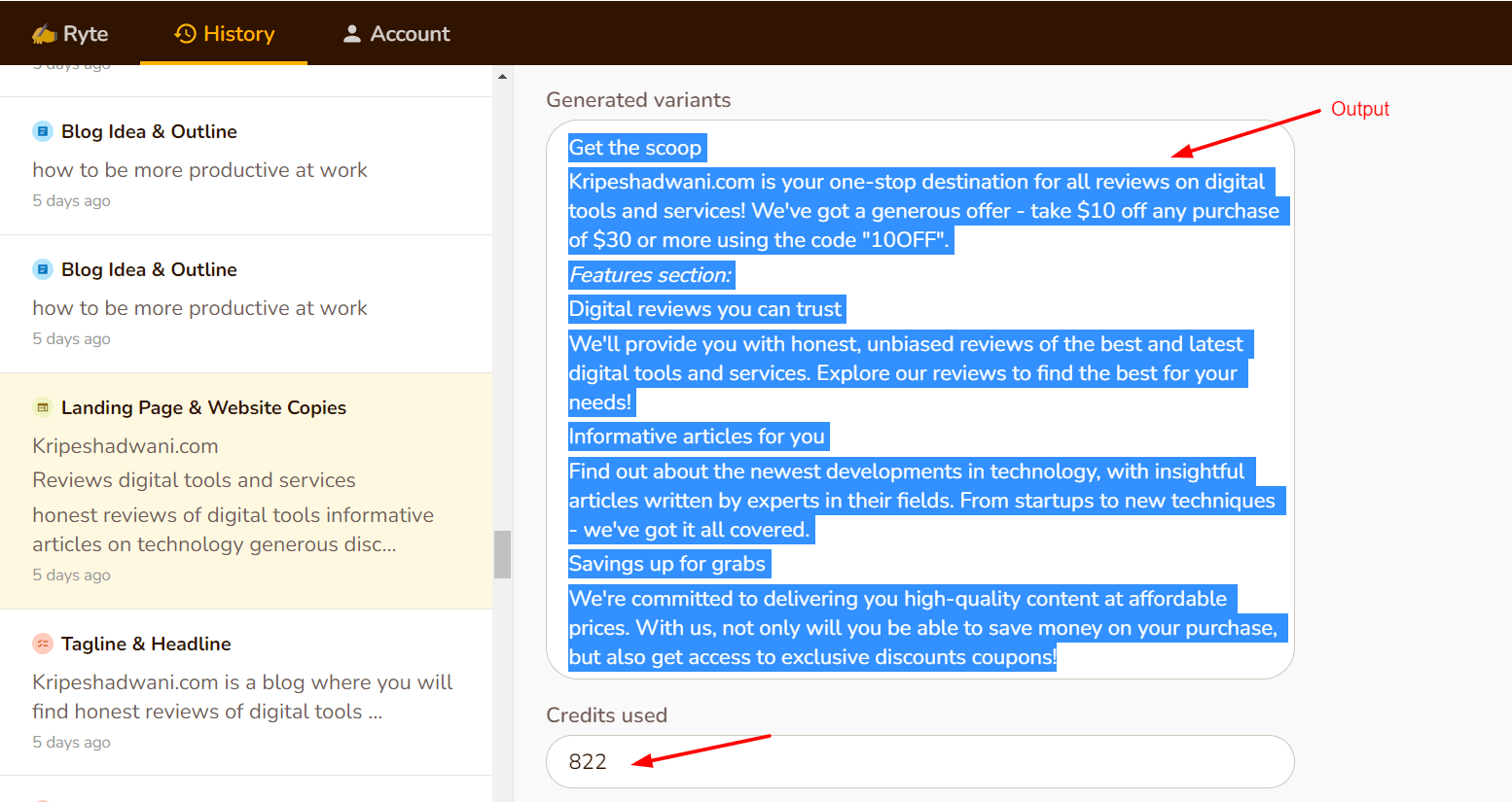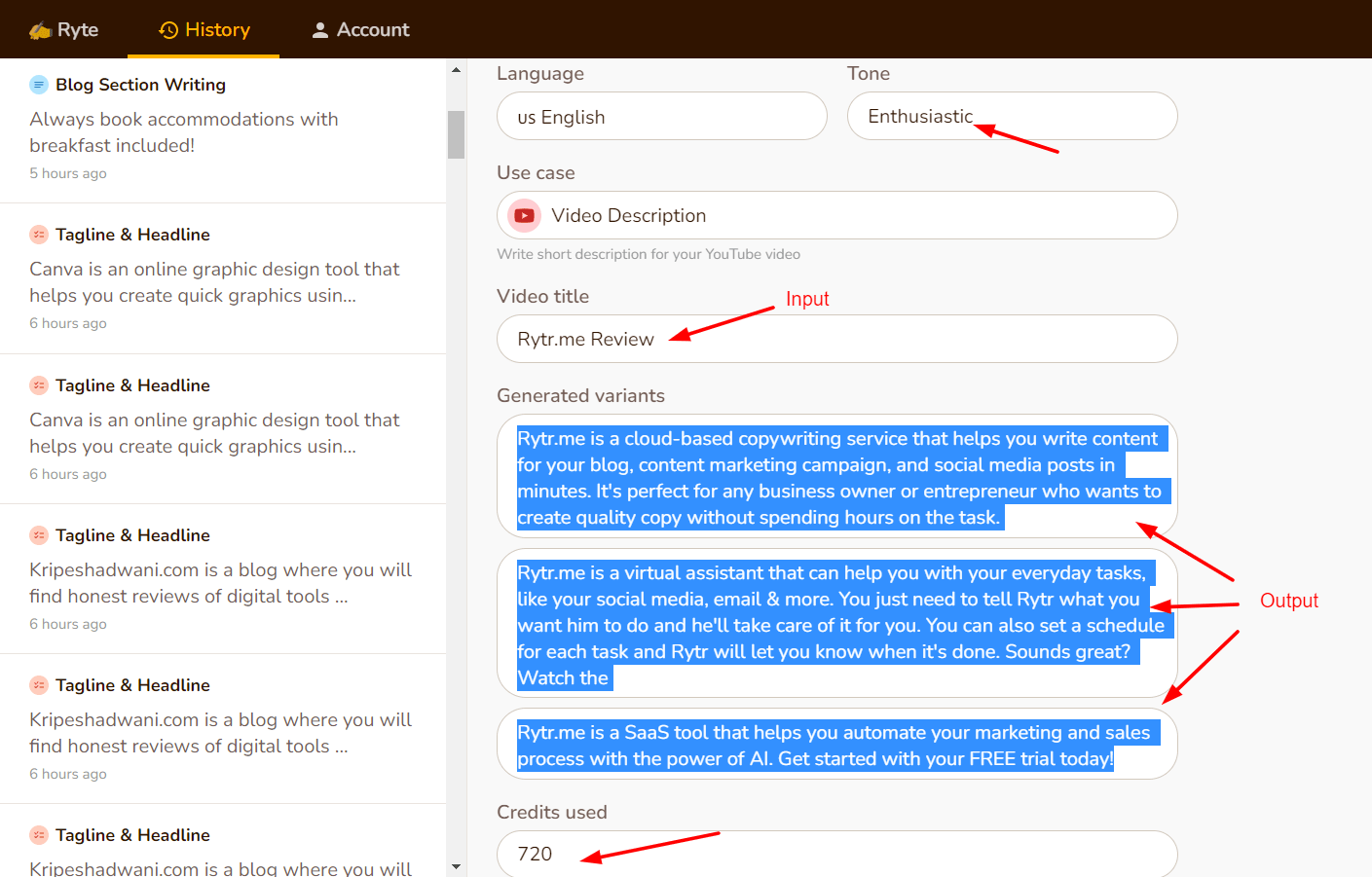 Rytr also offers the History tab for revisiting your previously generated content. You can also keep a note of the characters used under the Accounts tab.