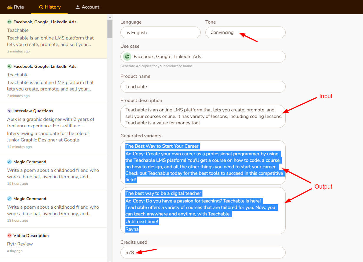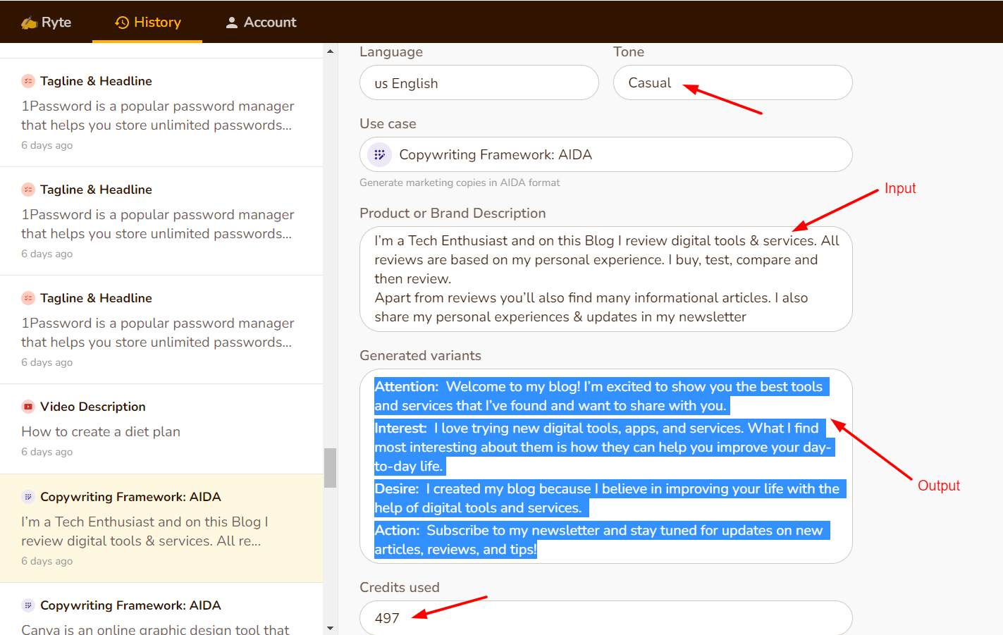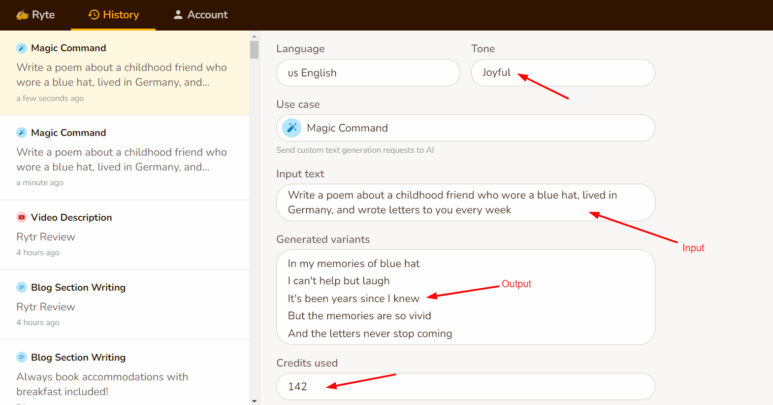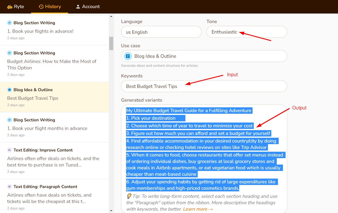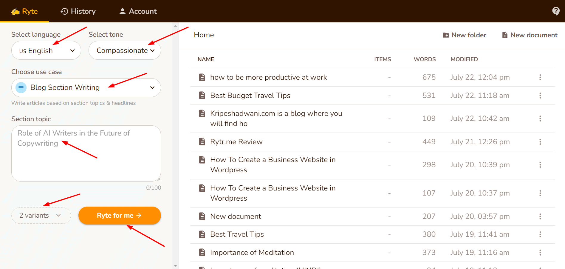 Rytr also offers the History tab for revisiting your previously generated content. You can also keep a note of the characters used under the Accounts tab.