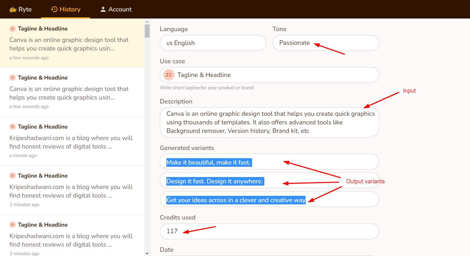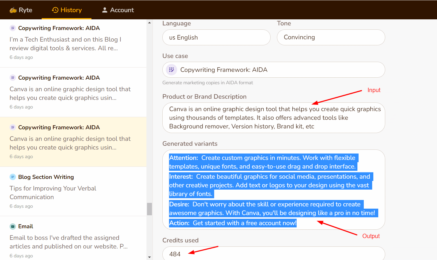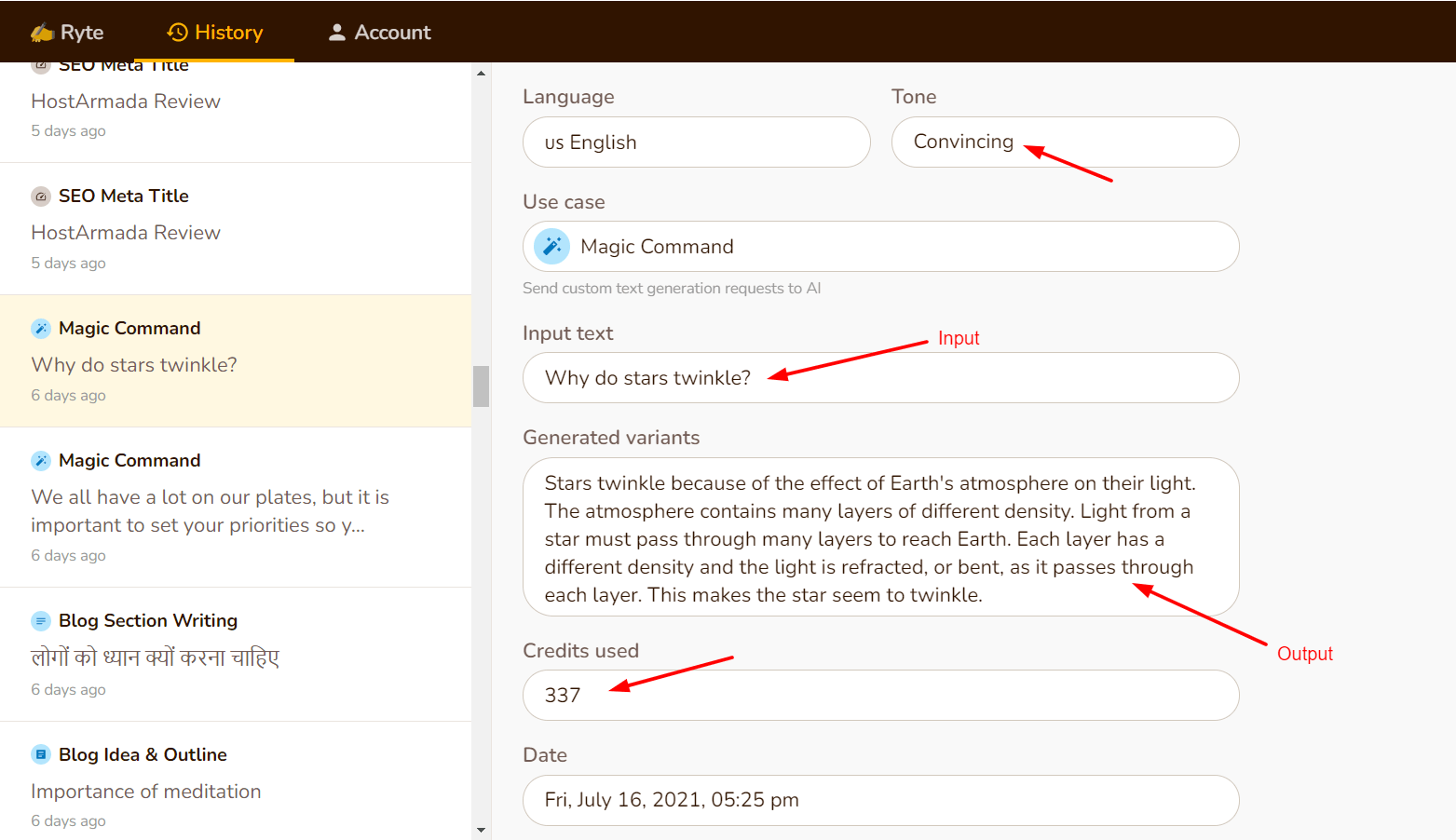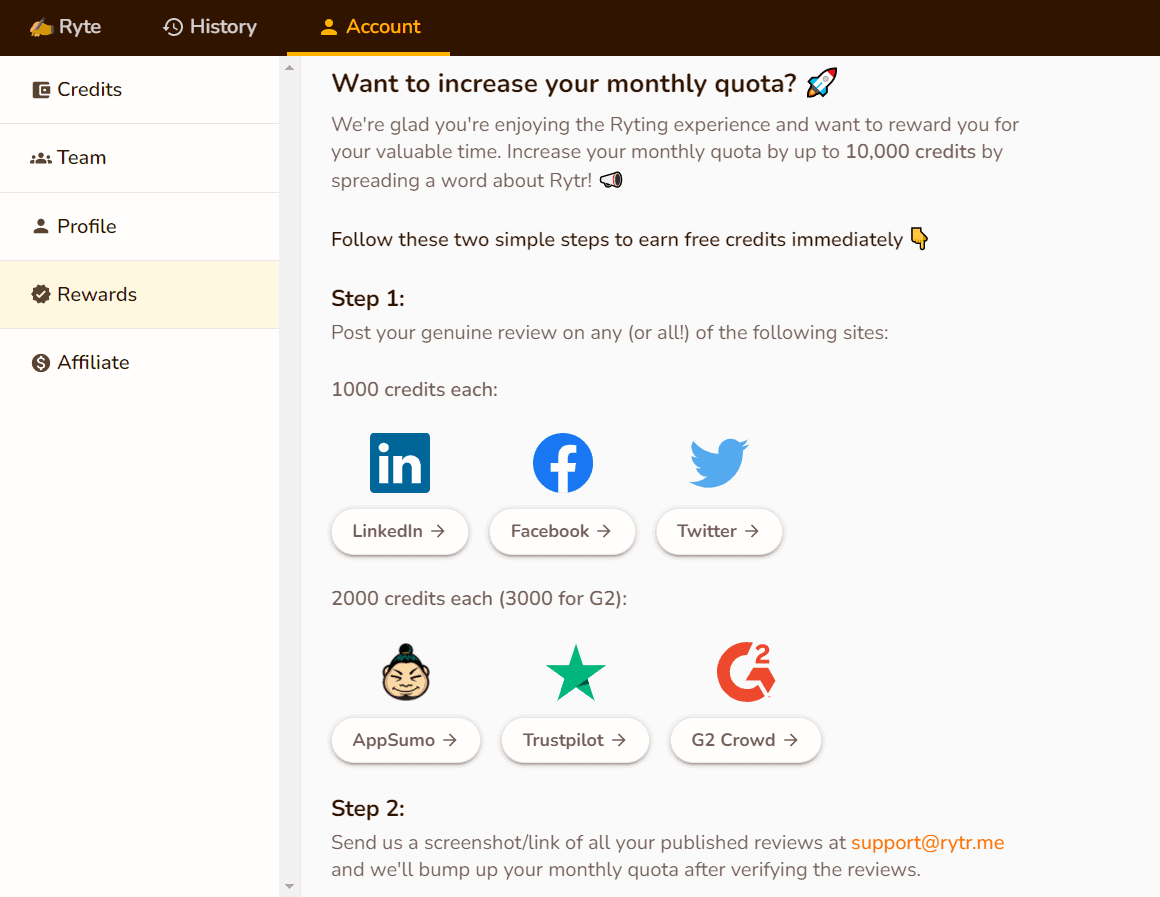 Rytr also offers the History tab for revisiting your previously generated content. You can also keep a note of the characters used under the Accounts tab.