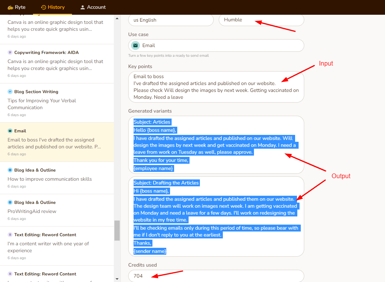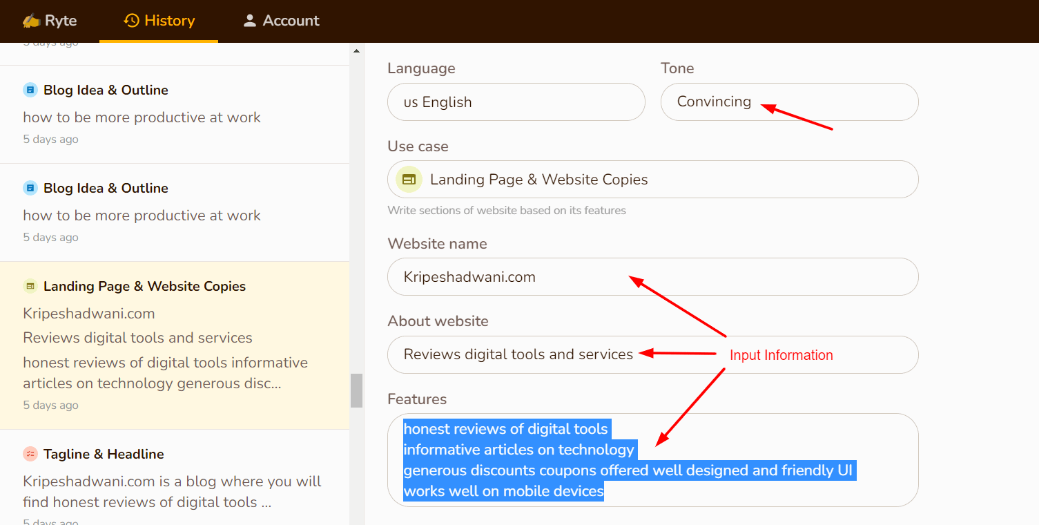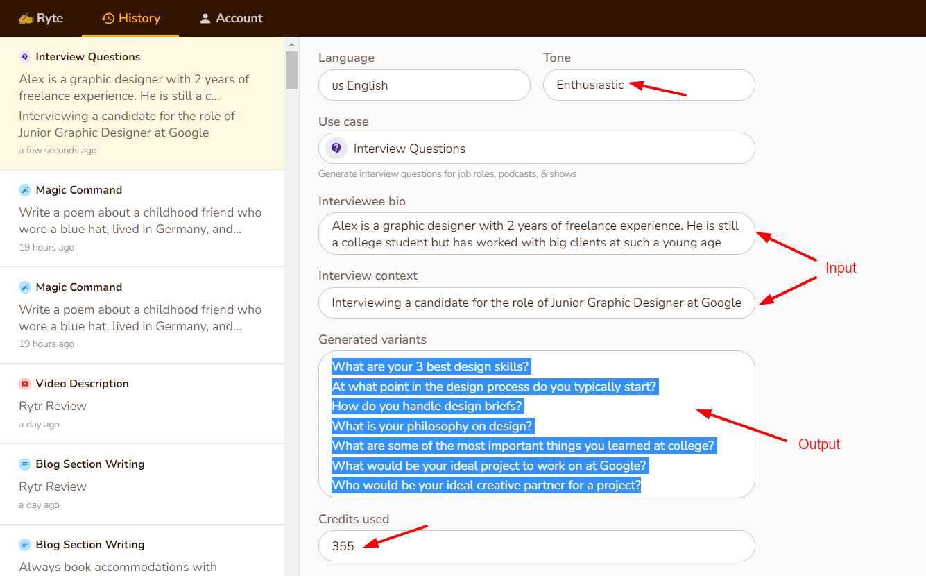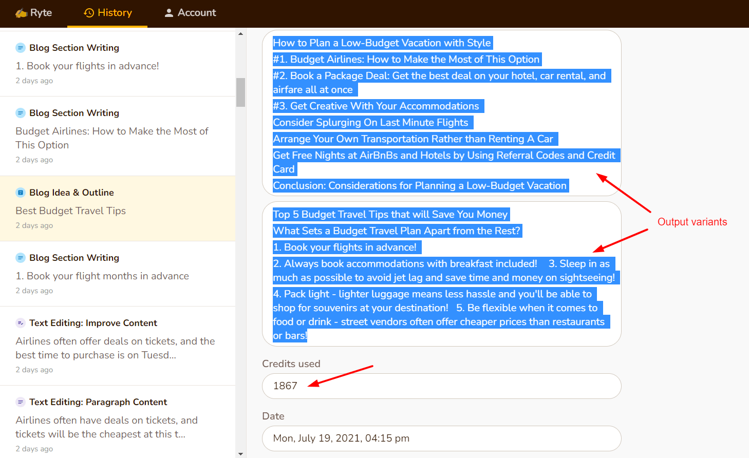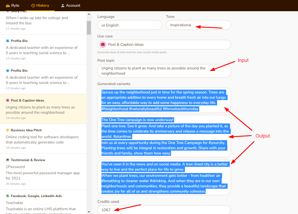 Rytr also offers the History tab for revisiting your previously generated content. You can also keep a note of the characters used under the Accounts tab.