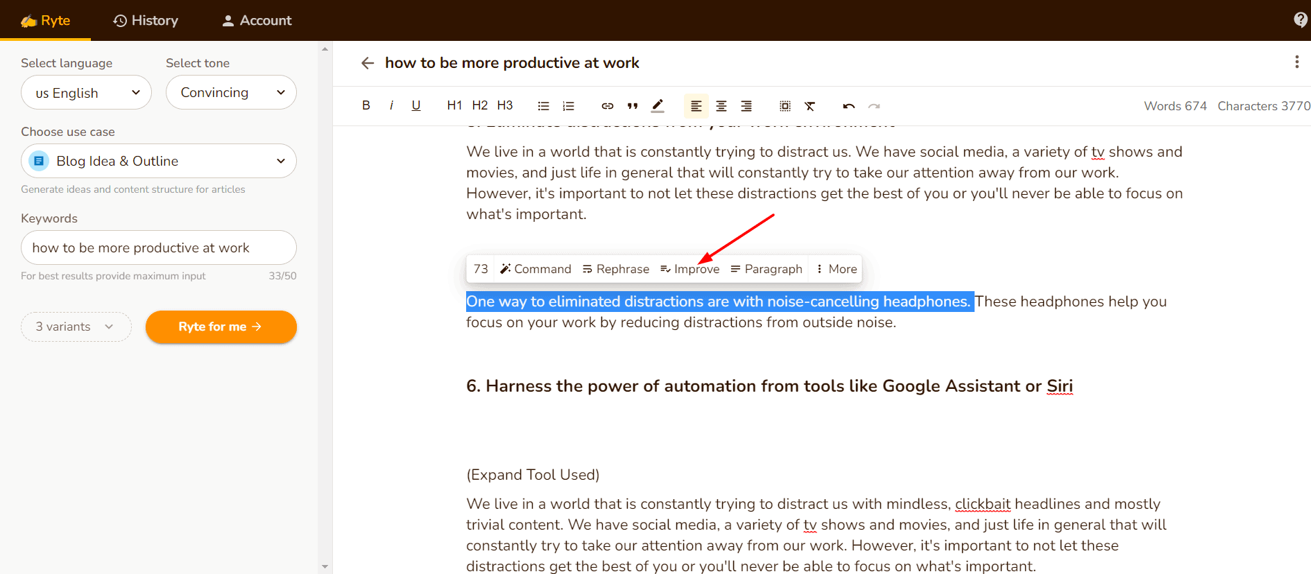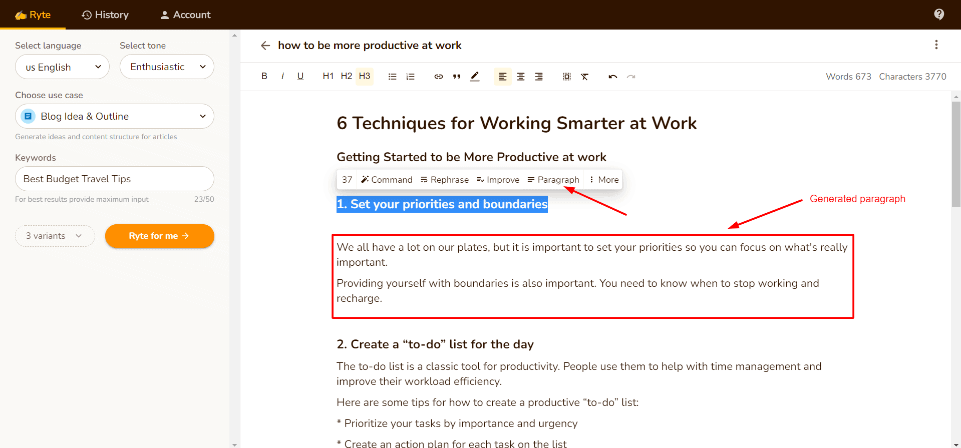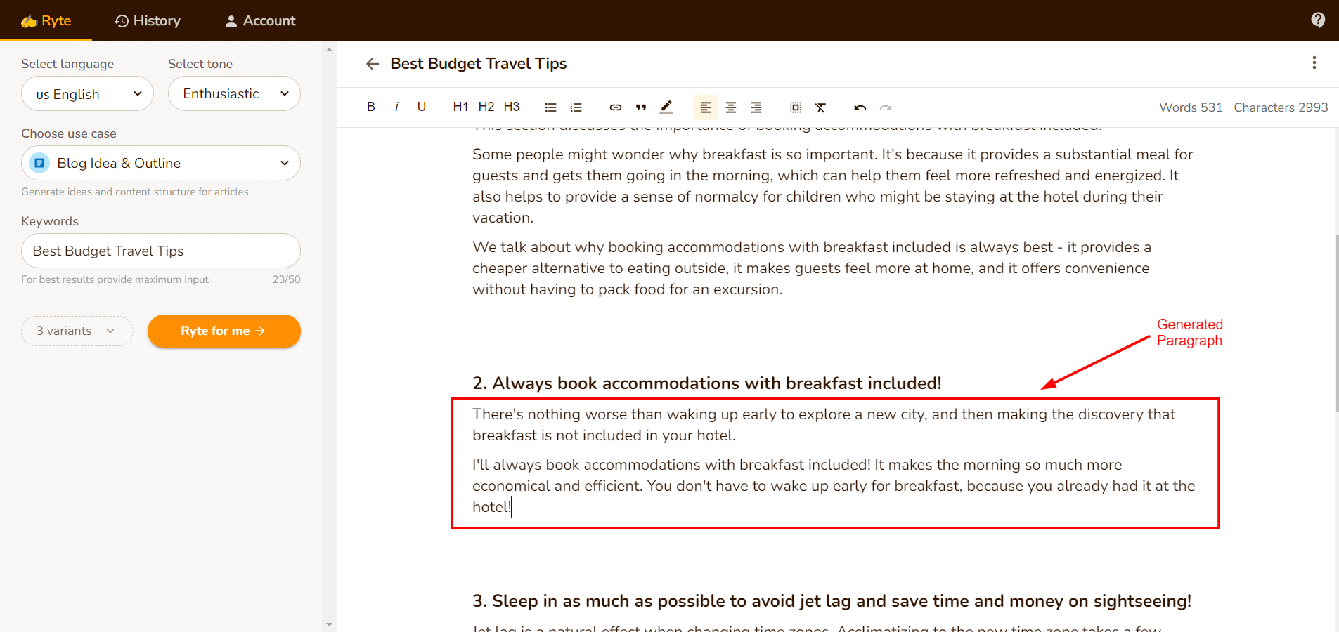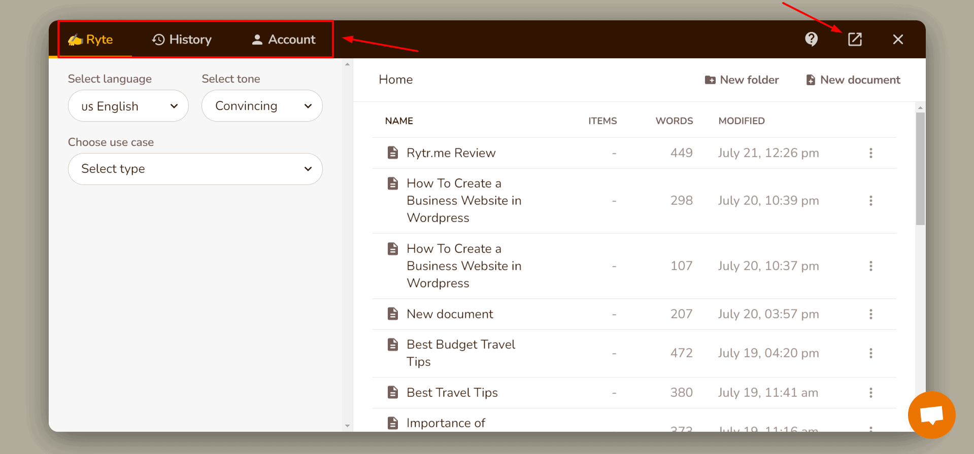 Rytr also offers the History tab for revisiting your previously generated content. You can also keep a note of the characters used under the Accounts tab.