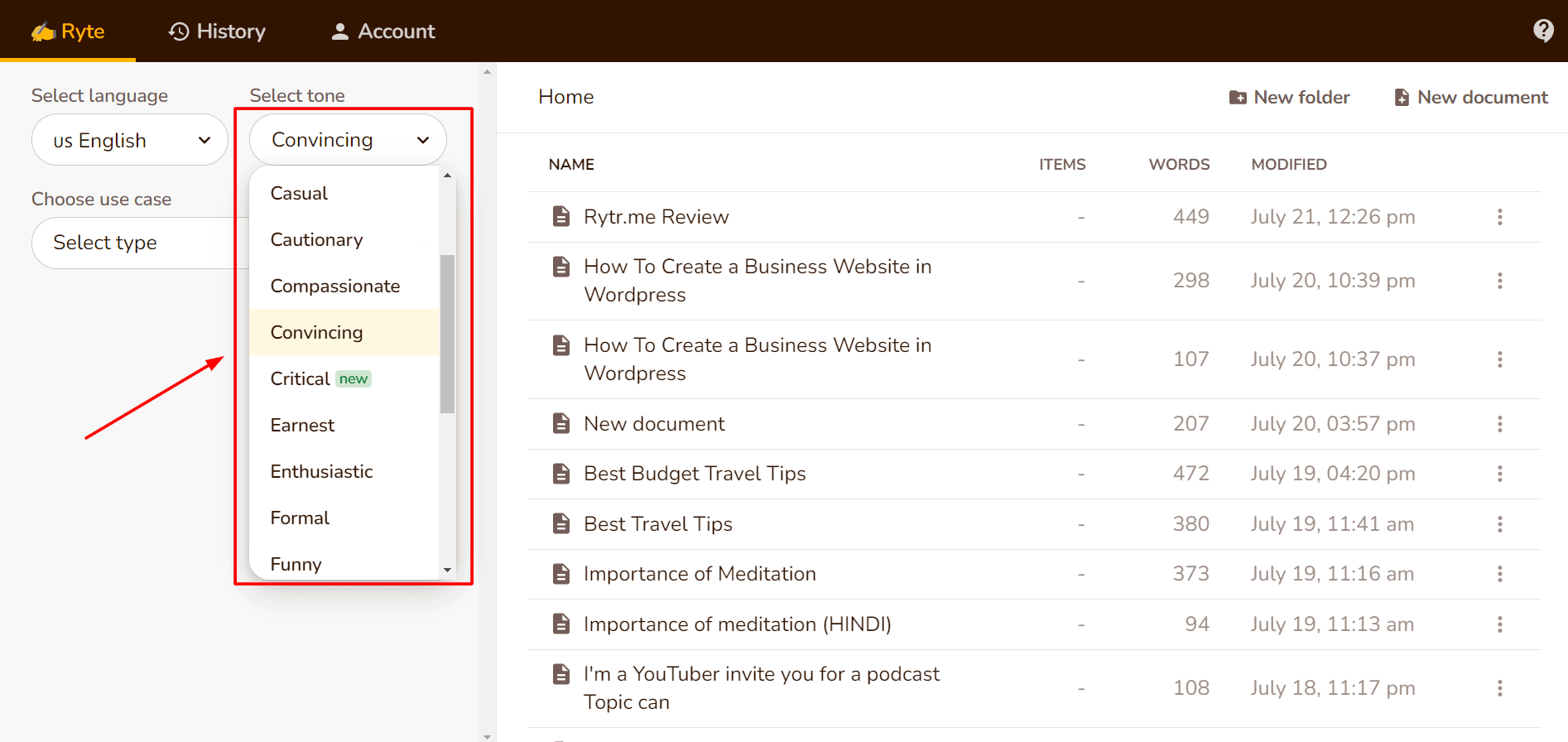 Rytr offers 21 tones for expressing a variety of emotions. Humorous, casual, convincing, worried, humble, passionate, formal, etc are some examples. They have recently added the Critical tone as well.