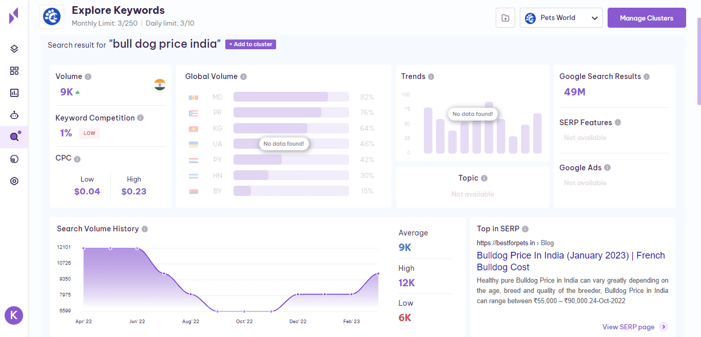 For instance, it displays the keyword’s search volume along with its history, competition, CPC, trends, and global search volume.