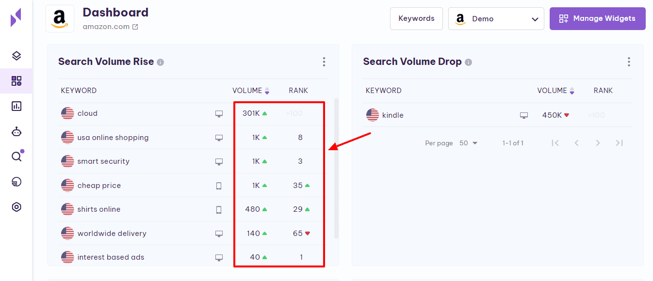 These sections monitor the search volume of your specified keywords and display the increased or decreased search volume along with their rankings in a tabular format.