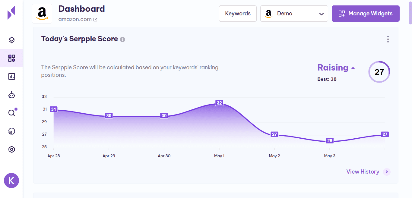 This information is displayed in colorful and attractive line graphs. It also shows if the Serpple Score is Falling, Raising, or has No Change along with the Best Score.