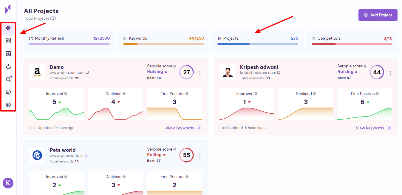 The user interface of Serpple looks clean and minimalistic with a modern design. The main screen features a list of your projects along with the keyword and project limits mentioned on top. You can find the features and tools neatly arranged on the left panel.