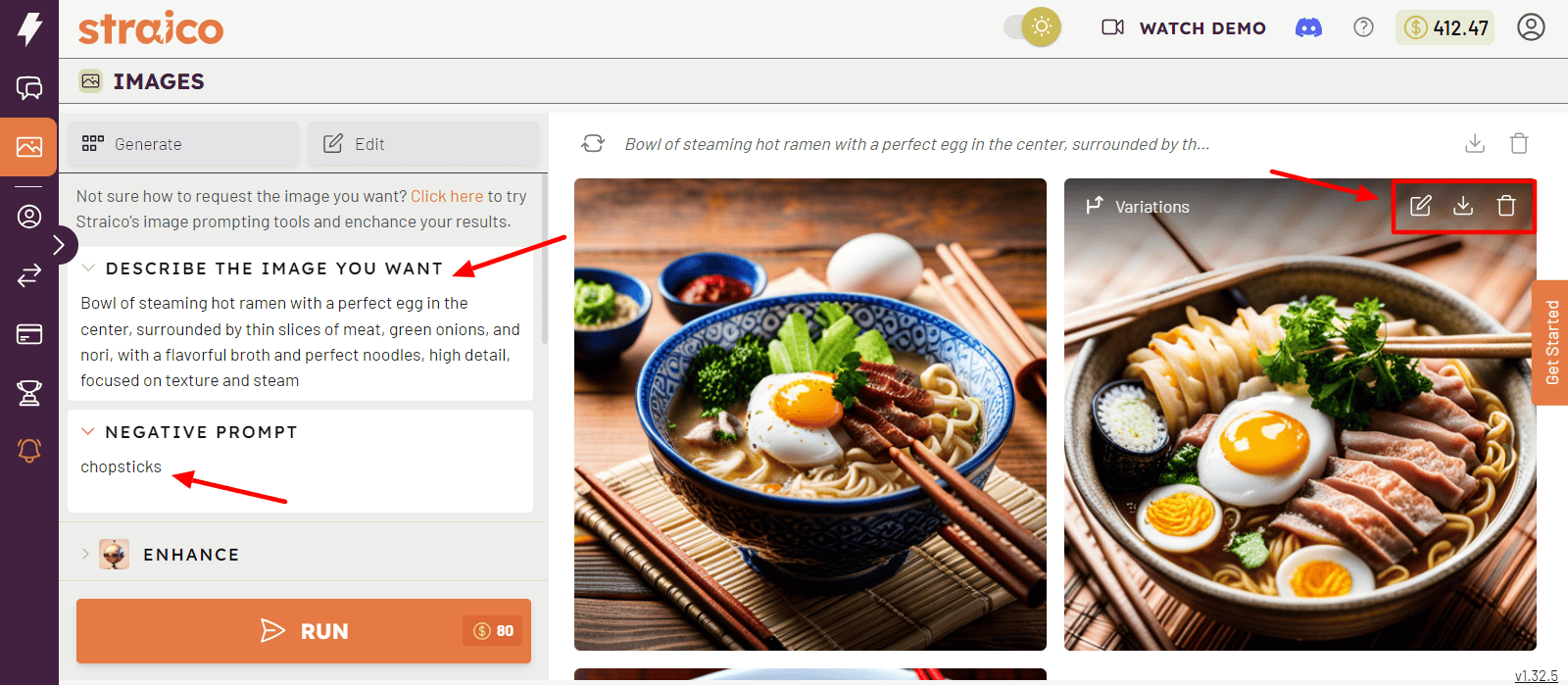 Here’s an image about “a bowl of ramen with eggs”. I liked the quality and prompt adherence of the AI-generated images. However, it doesn’t work well with negative prompts. For instance, I mentioned “chopsticks” as a negative prompt. But you can still see them in the image!