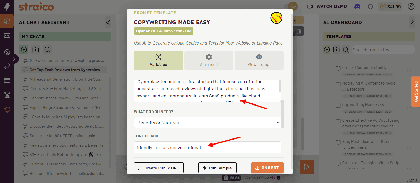 For example, when I selected the Copywriting template from the Content category, it asked me to specify variables like company or product name, details, the copywriting type, tone of voice, and additional instructions.