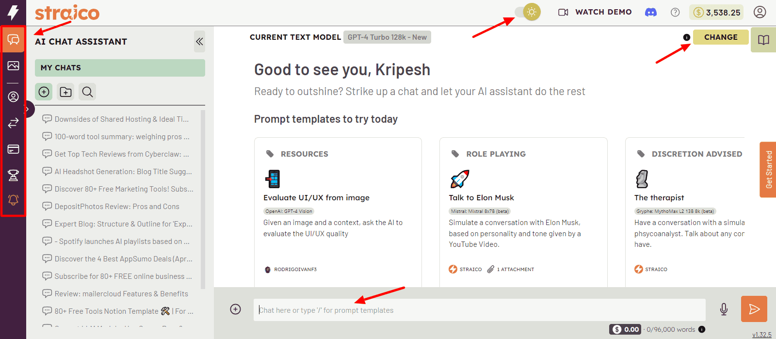The user interface of Straico is pretty modern in terms of colors and design. The left column offers all the tools you can use, along with billing, rewards, profiles, and more.