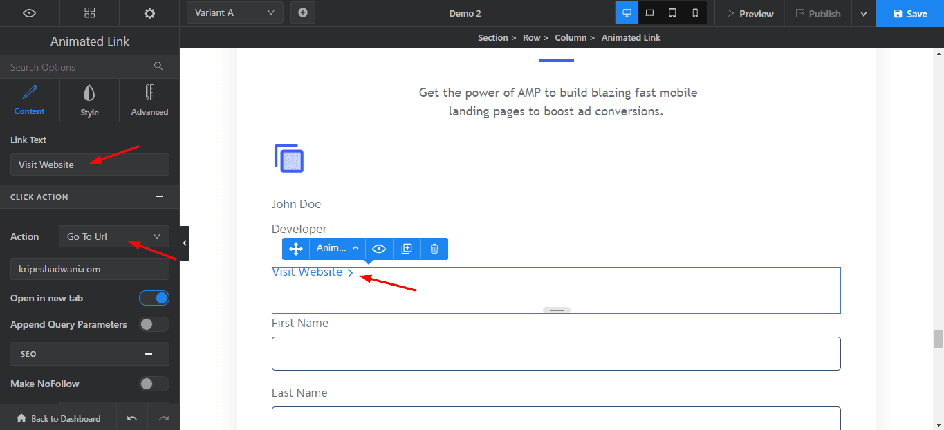 For example, clicking on the link might take you to a URL, a section, an email, a lightbox, or call a person! When you hover your mouse pointer over the anchor text, the animated effect will be played.