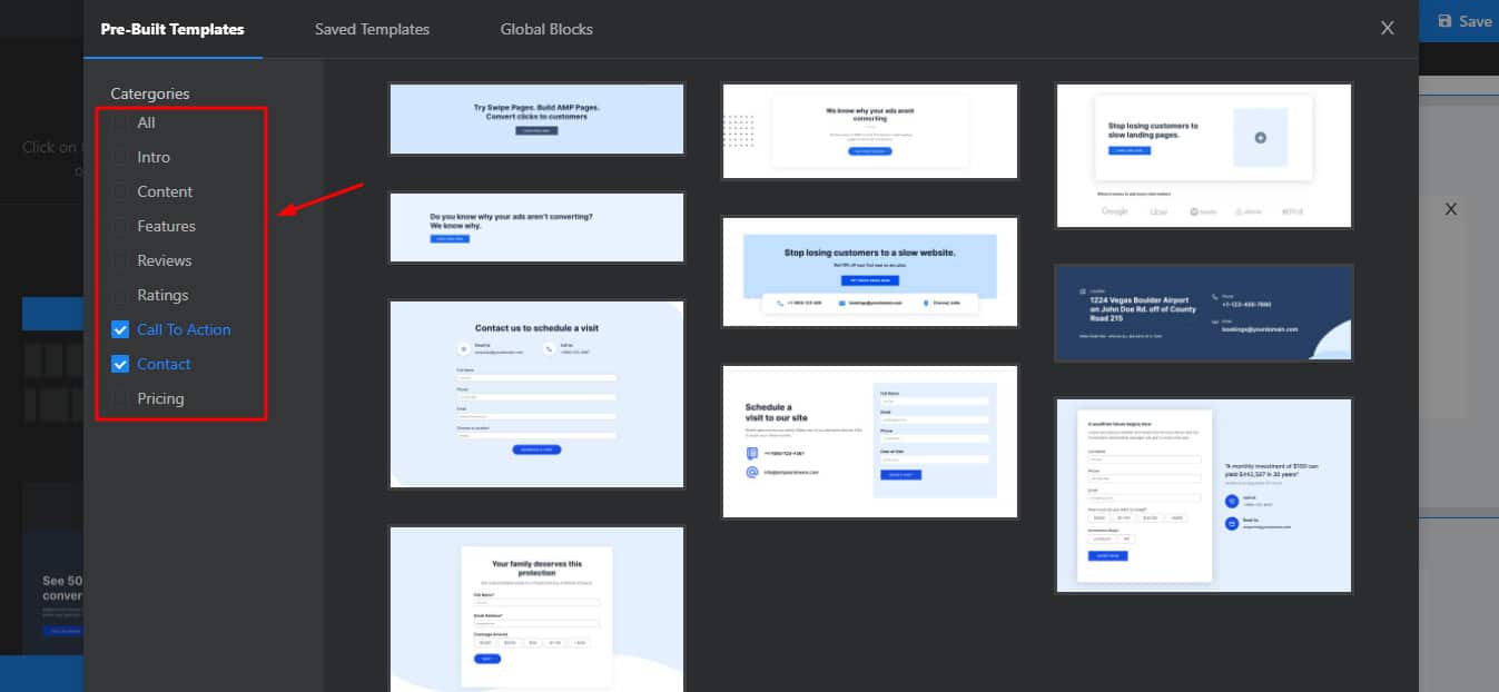 Or you can make use of templates to implement specific sections like Intro, Call to Action, Contact, Features, Rating, Reviews, and more!