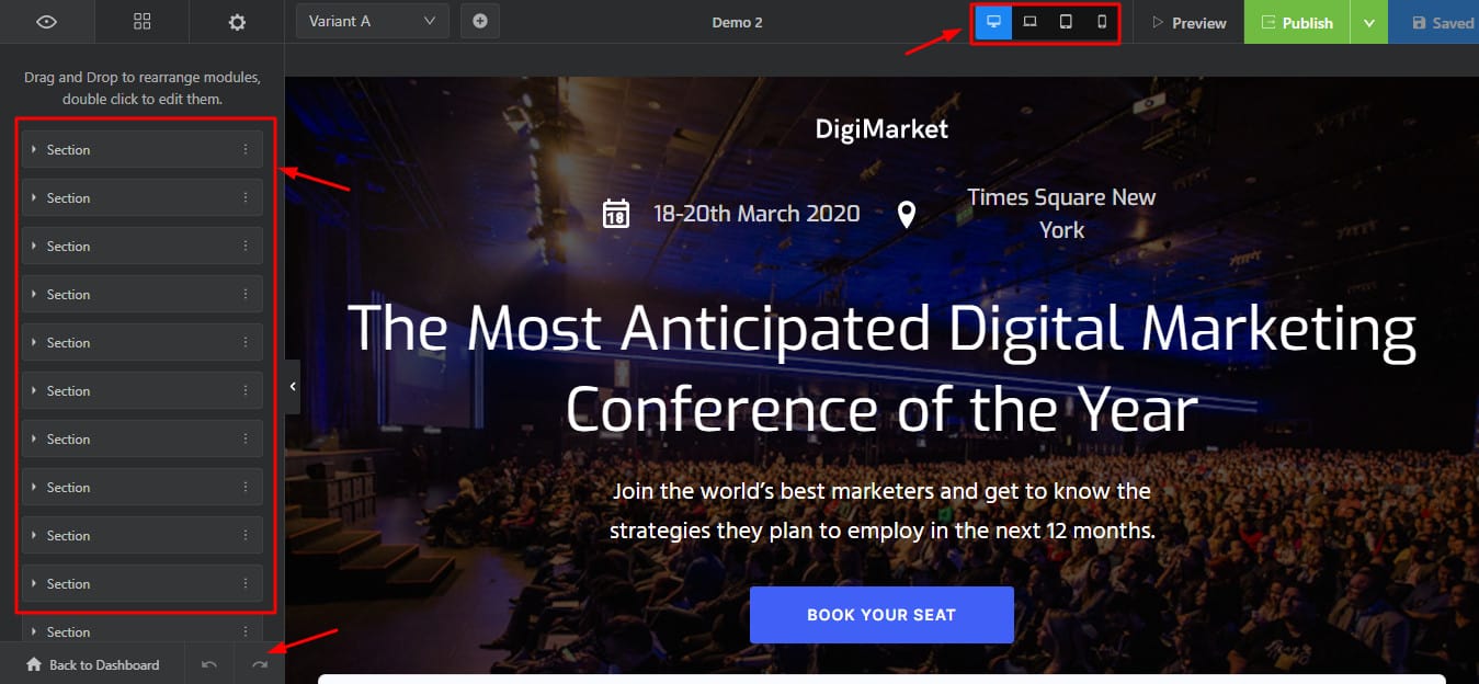 On the bottom left, you can find handy undo and redo buttons. You can also switch between desktop, tablet, and mobile view from the top panel.