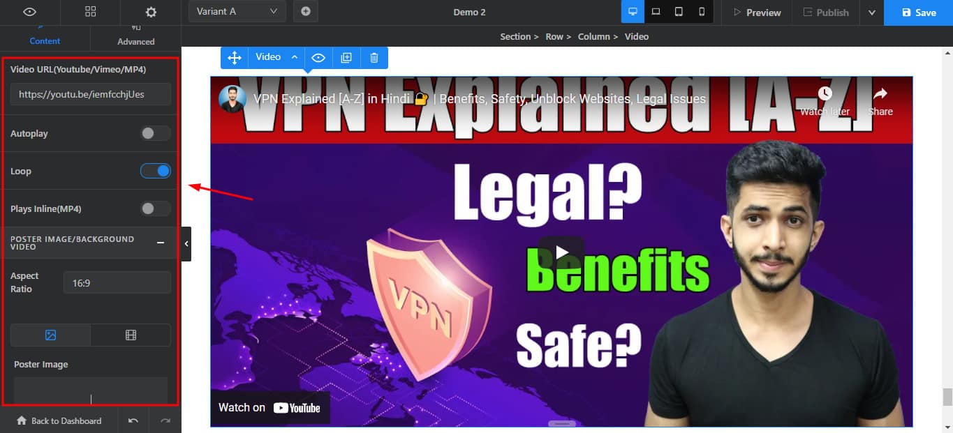 The Video element allows you to add videos to your landing pages through links.