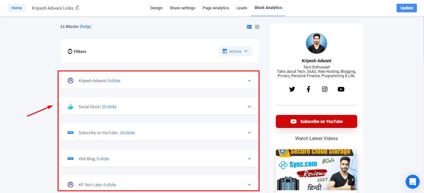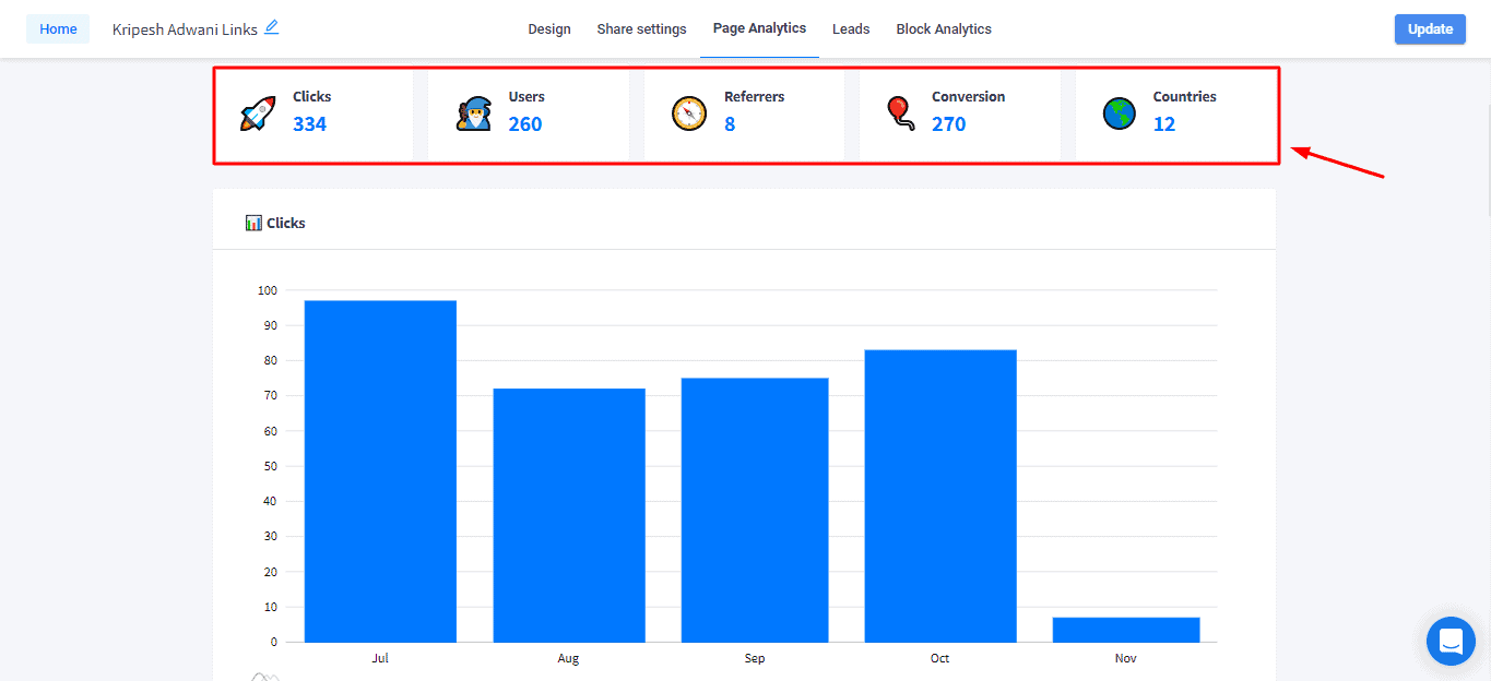 You get link filters, so you can view detailed metrics for the present day, week, month, or all time statistics.
