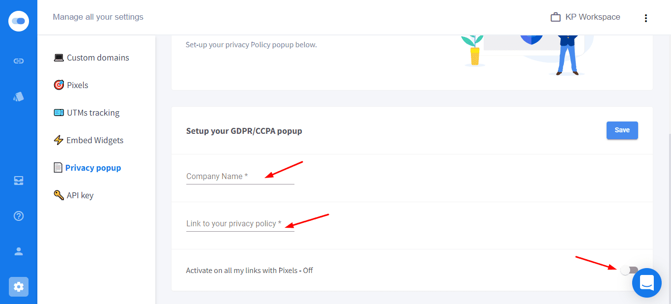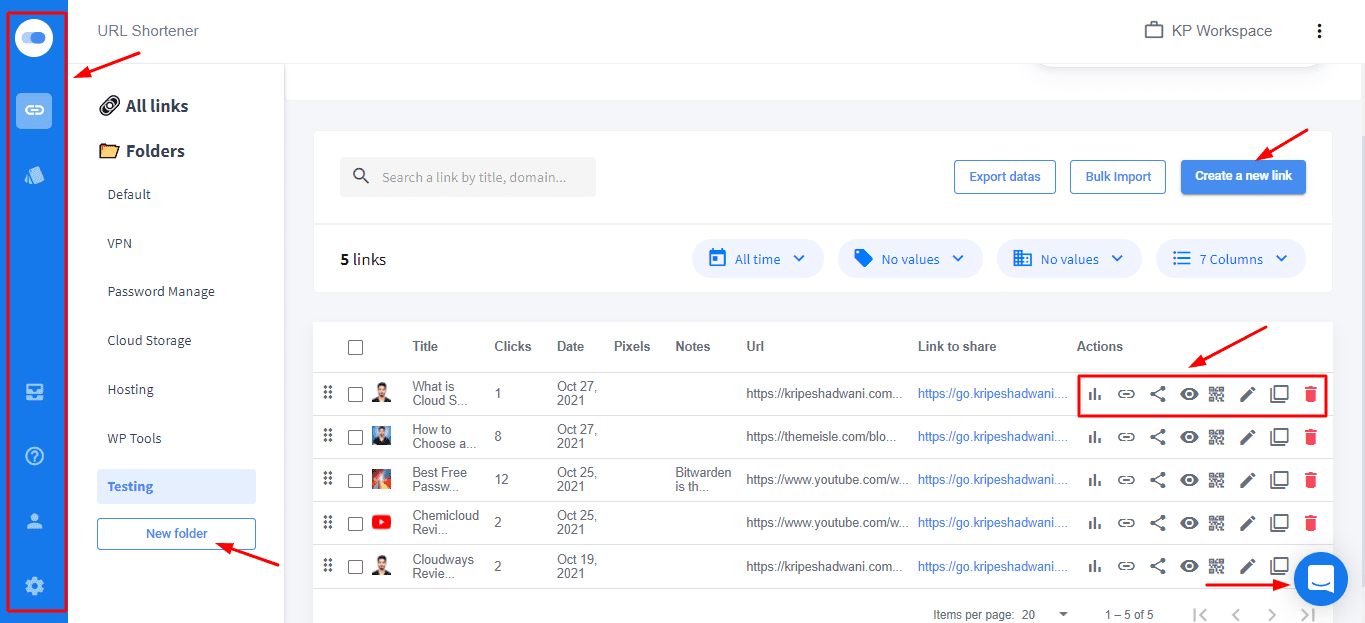 The first step is to create a workspace for yourself. Once you do that, you can create customized links, add them to different folders and access a variety of Settings from the left panel.