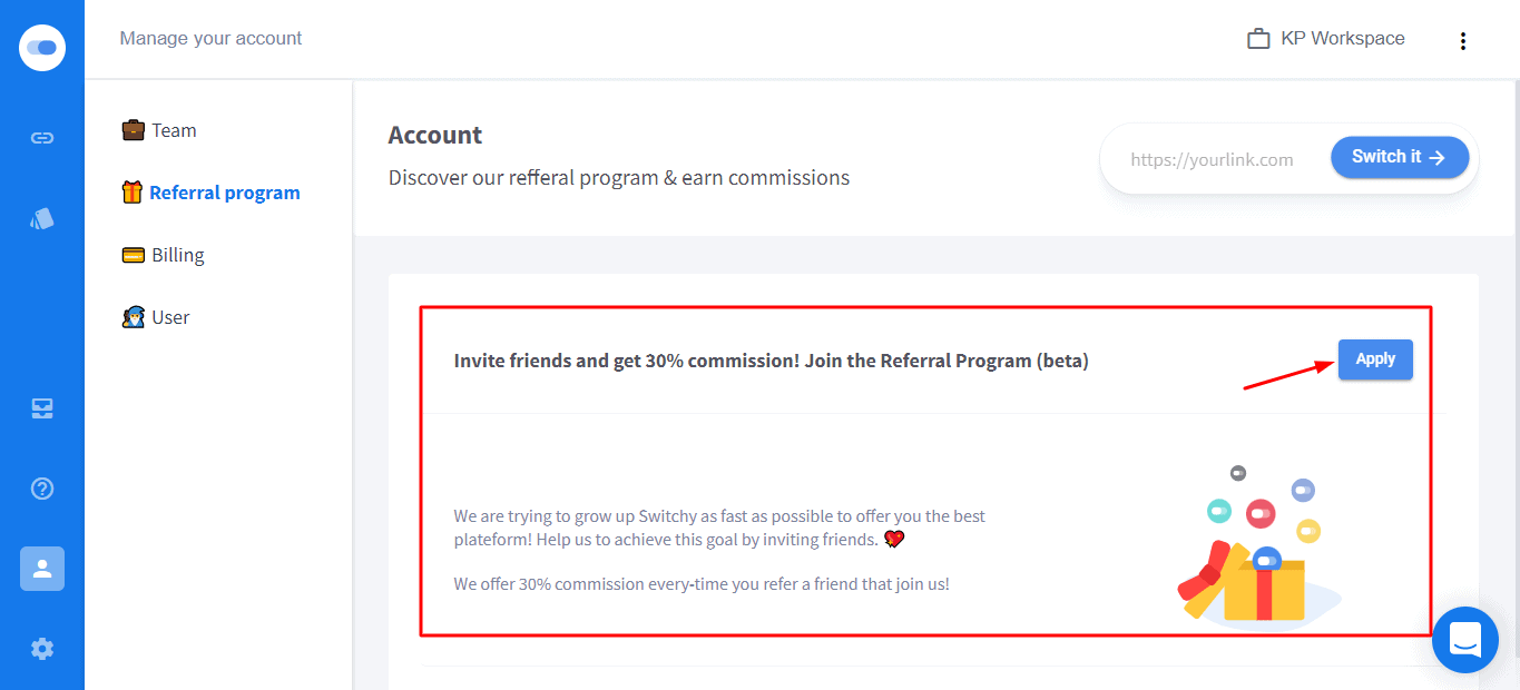 All you need to do is simply share their referral links and promote Switchy with your friends and family. For every new user joining Switchy platform through your links, you will earn a 30% commission!