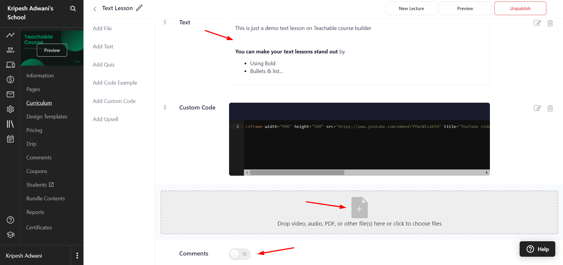You can easily create coding lessons with Teachable. It supports 17 languages along with color coding, which is very useful for programming courses.