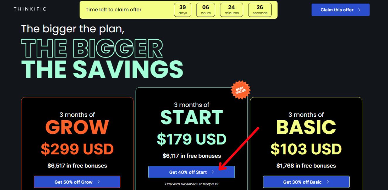 Grow with Thinkific will give you a 50% discount on 3 months of the Thinkific Grow plan. All users to claim this offer will also get 1 hour of 1:1 expert coaching. Whereas, the Start with Thinkific plan will give you a 40% discount on 3 month of the Thinkific Start plan. The Thinkific Basic plan will offer with 30% discount on 3-month subscriptions.