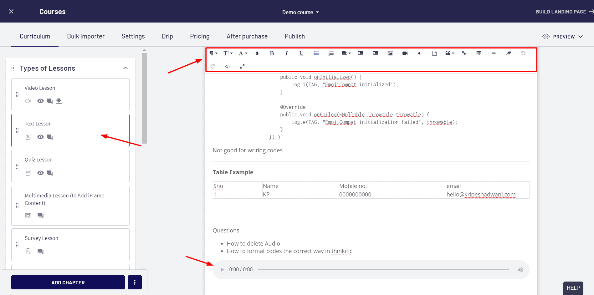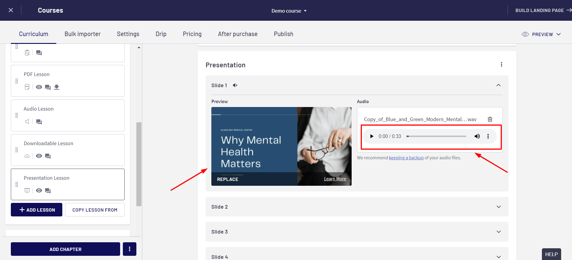 You can create a variety of lessons on Thinkific. For example, text lessons, video and audio lessons, presentations, quiz lessons, surveys, etc.