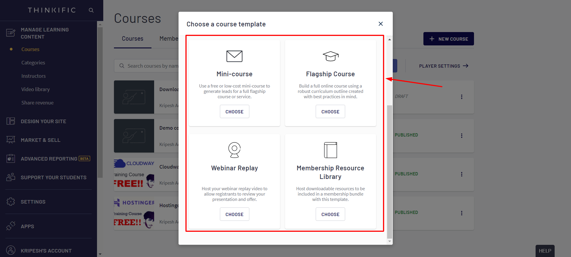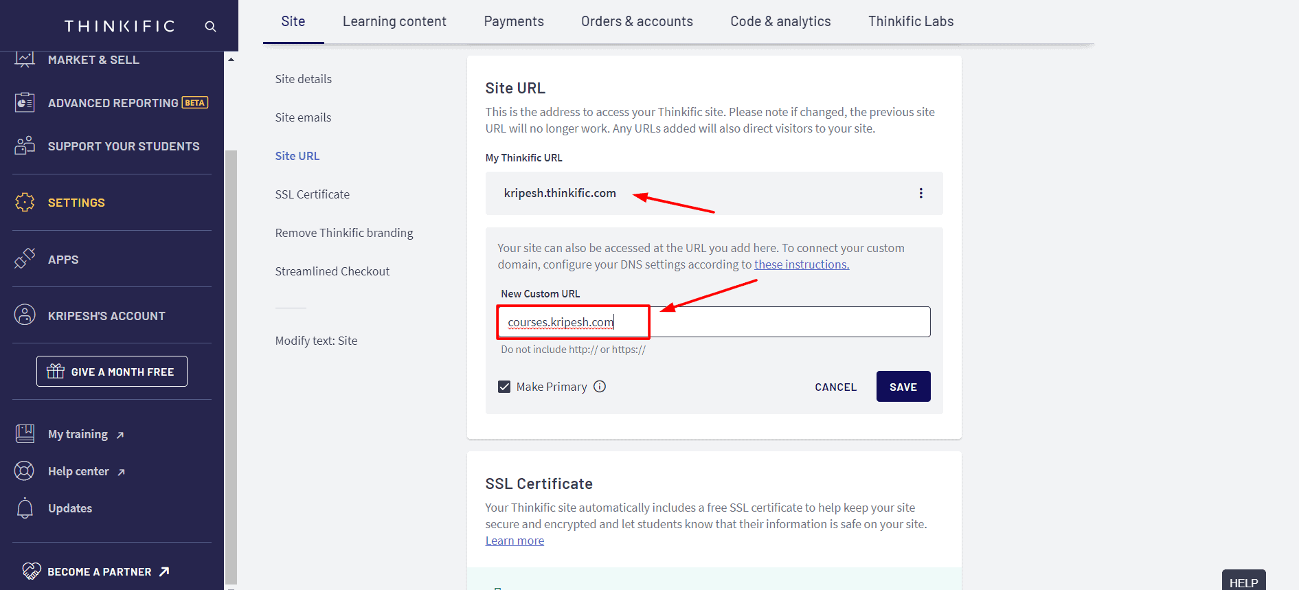 For example, I can change my URL from “Kripesh.thinkific.com” to “courses.kripesh.com” with its paid plans.