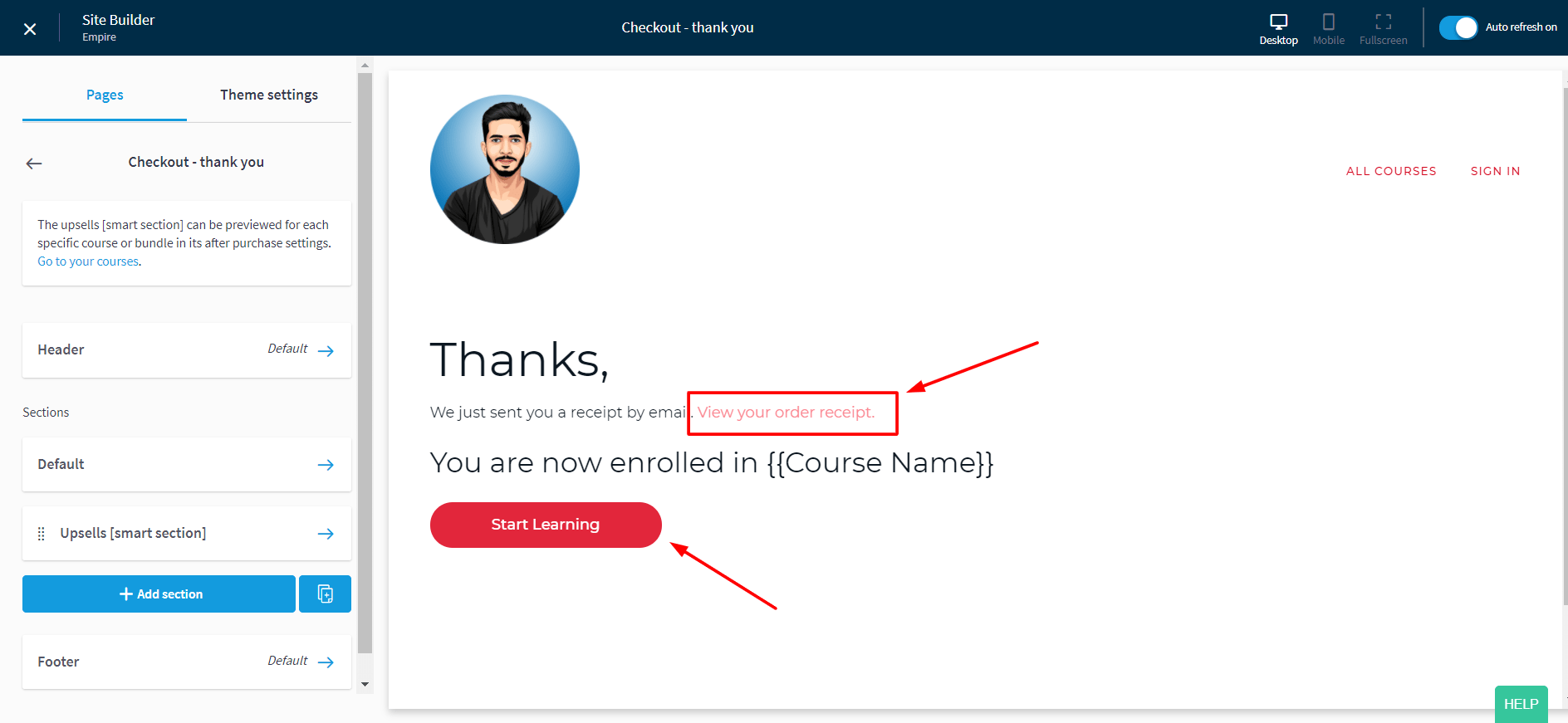 - On order receipts when they purchase a course