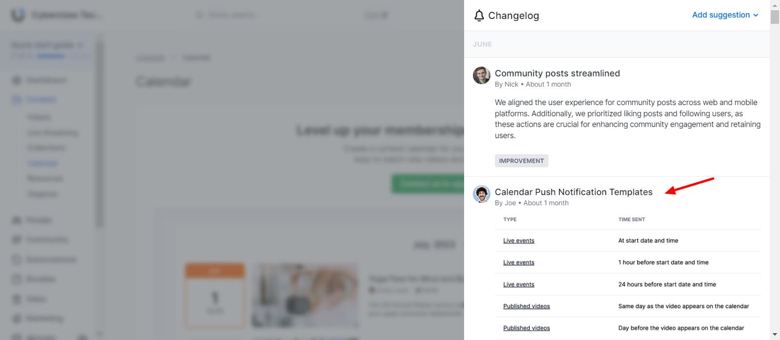Uscreen’s Changelog can be viewed from the top-right corner of the dashboard. Here, you can view the recent updates made on the platform. For instance, in the last month, they streamlined community posts and introduced calendar push notification templates.