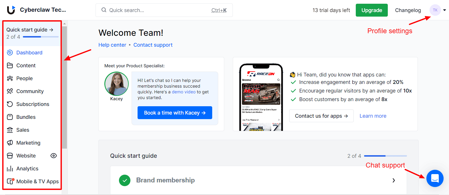 Uscreen offers a 14-day free trial requiring no card details. Here, you can upload, manage, and sell your video content on a subscription or one-time pricing. However, it doesn’t allow access to all the major features, like live streaming, community, content calendar, and mobile apps.