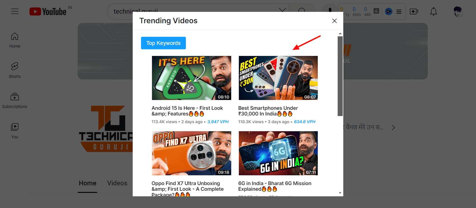 With the free version, VidIQ lets you add up to 3 competitors. How to calculate your competitor’s VPH? Just go to their channel and click on the ‘View Trending Videos’ option.